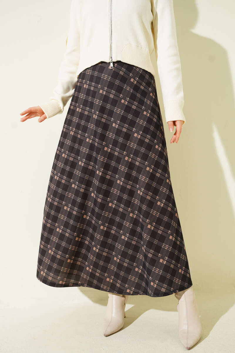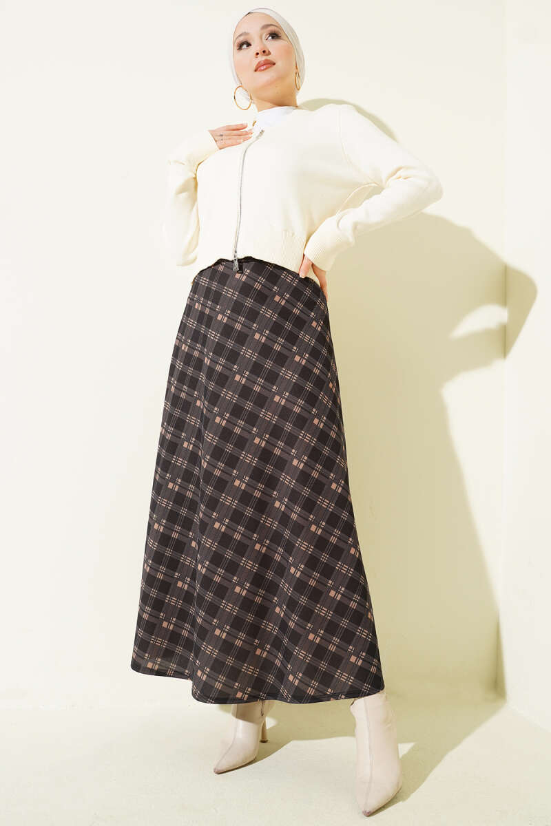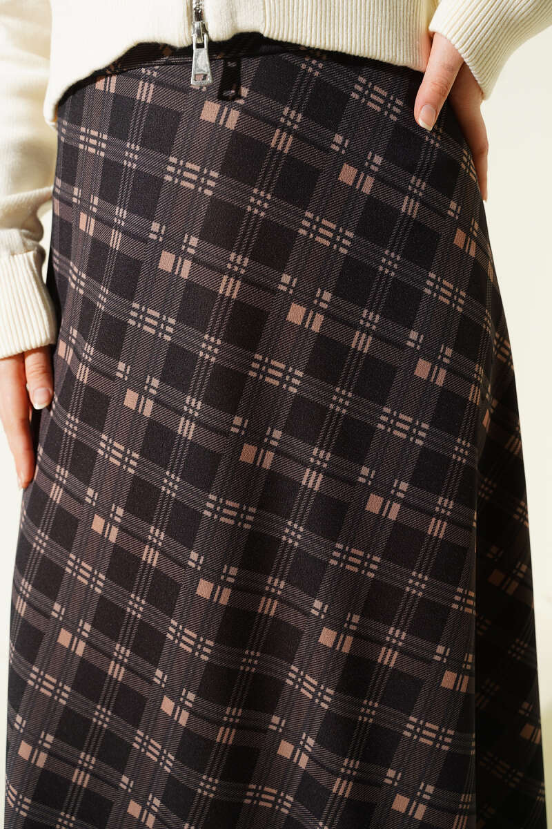 Ekose Desenli Kloş Dabıl Etek Kahve
