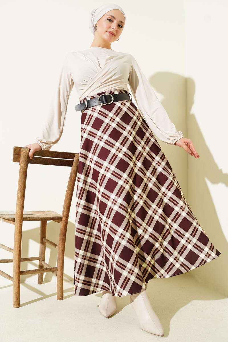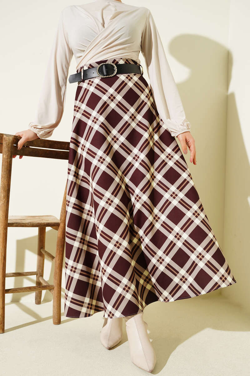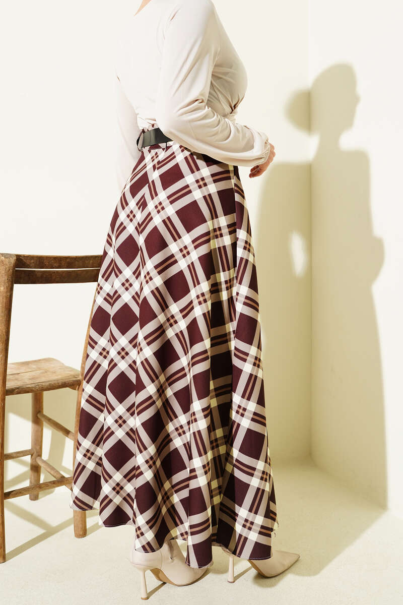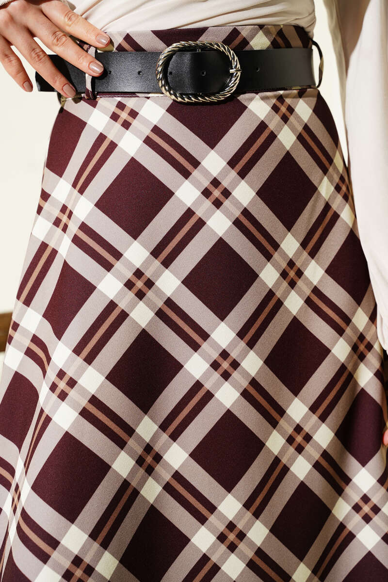 Ekoseli Kemerli Şifon Etek Mürdüm