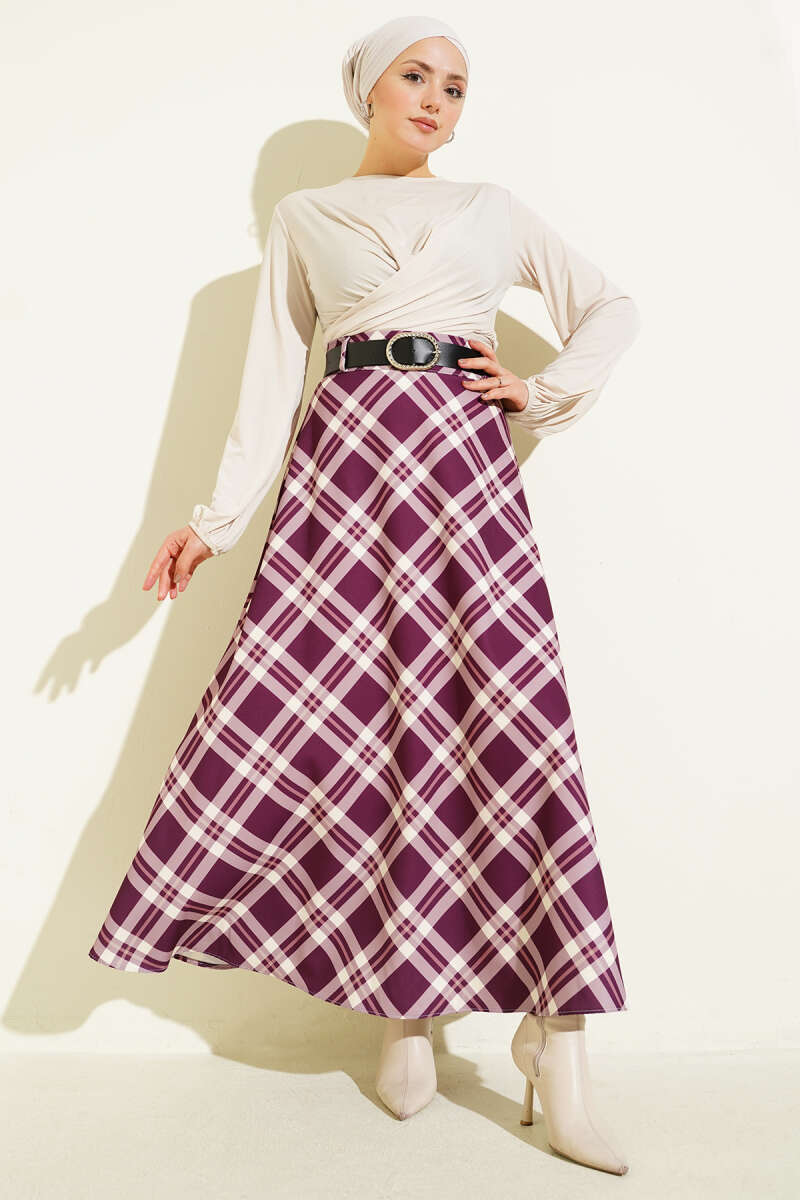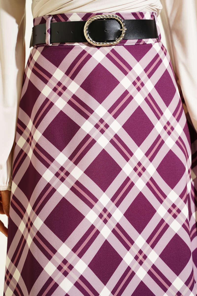 Ekoseli Kemerli Şifon Etek Mürdüm