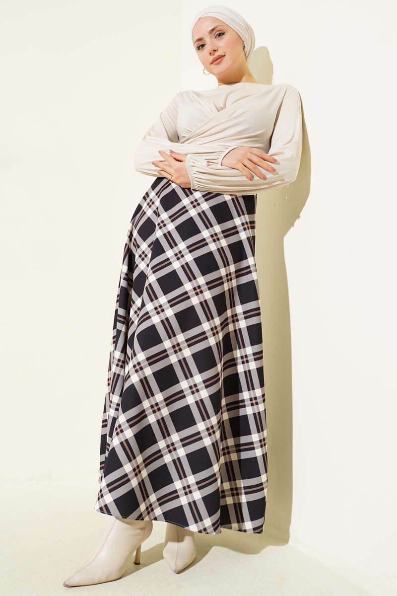 Ekoseli Kemerli Şifon Etek Acı Kahve
