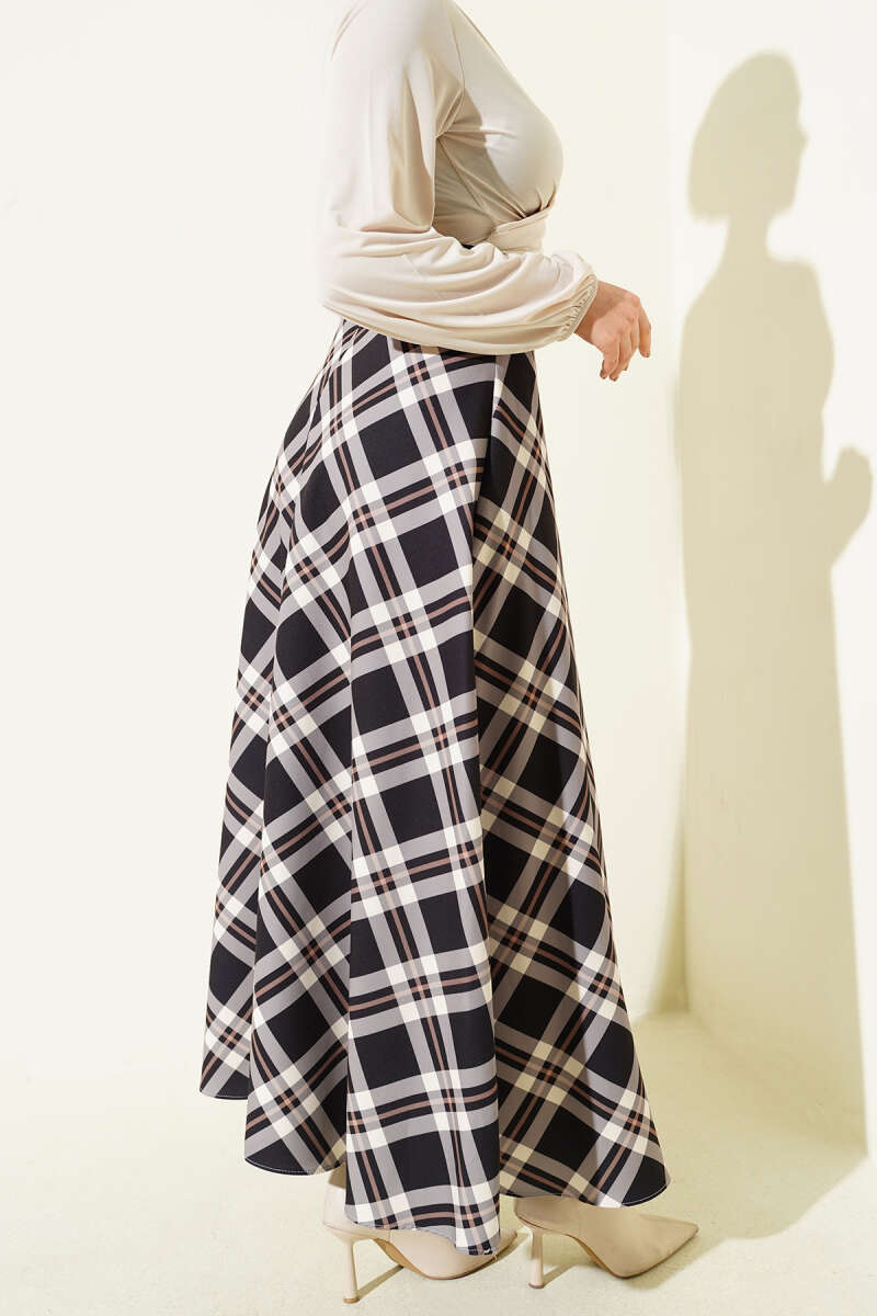 Kloş Ekose Desenli Kemerli Etek Lacivert