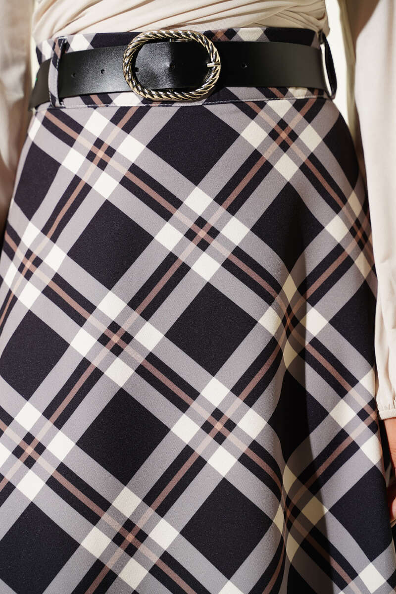Kloş Ekose Desenli Kemerli Etek Kahve
