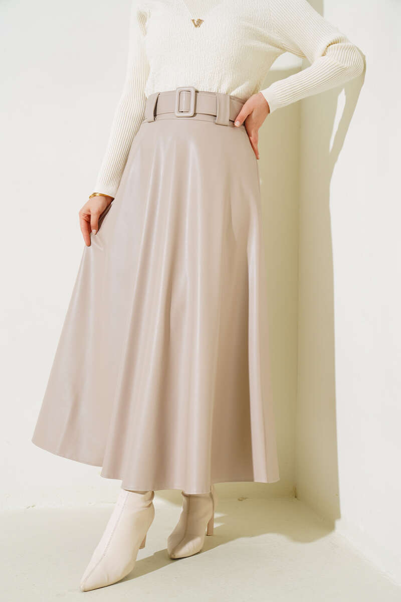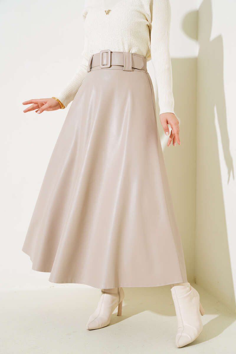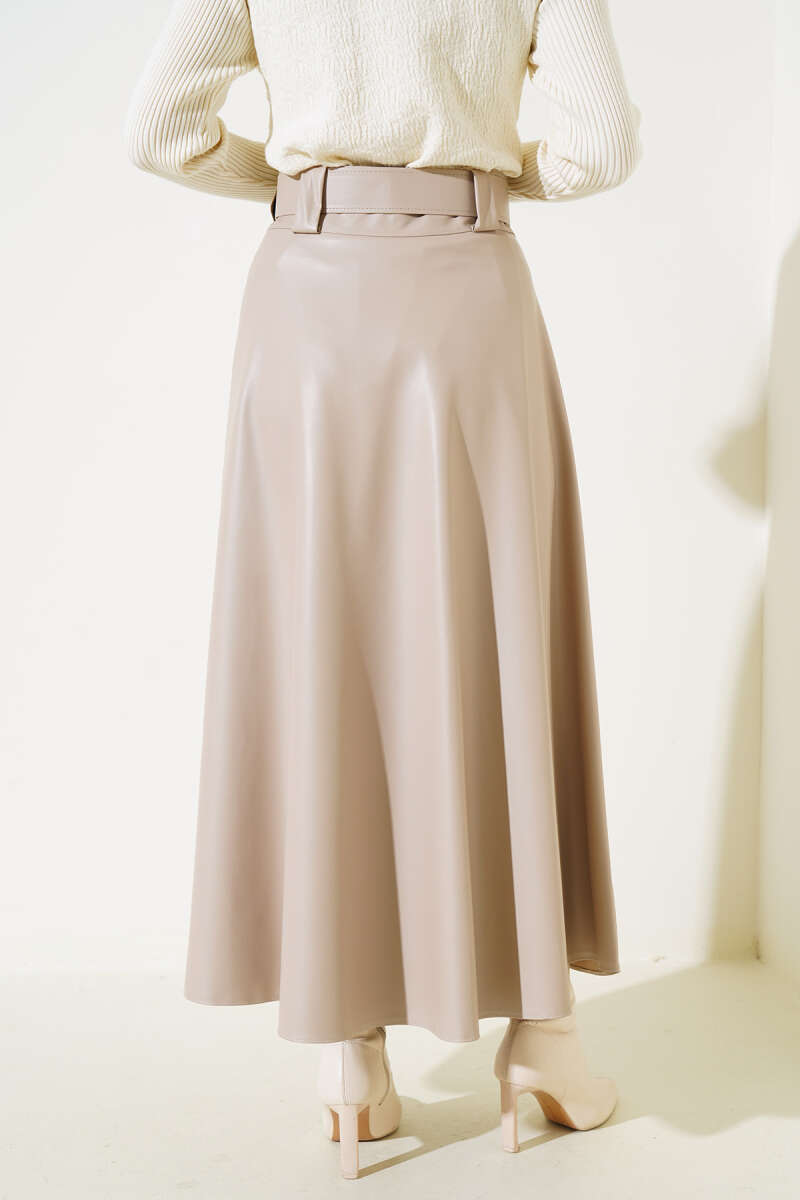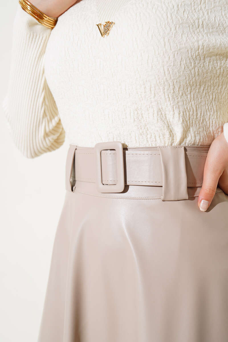 Kemer Aksesuarlı Ekoseli Etek Haki