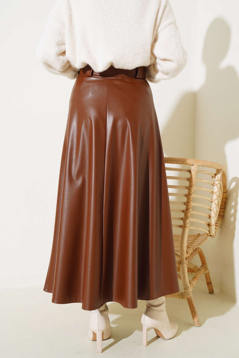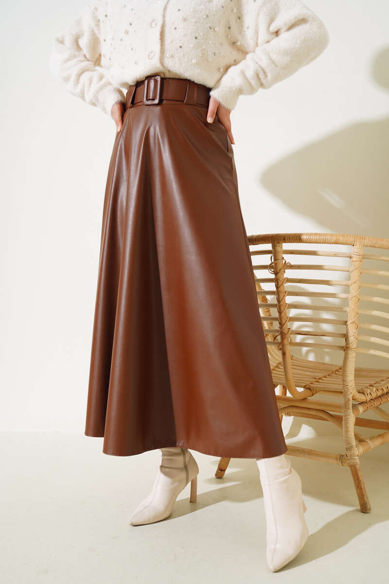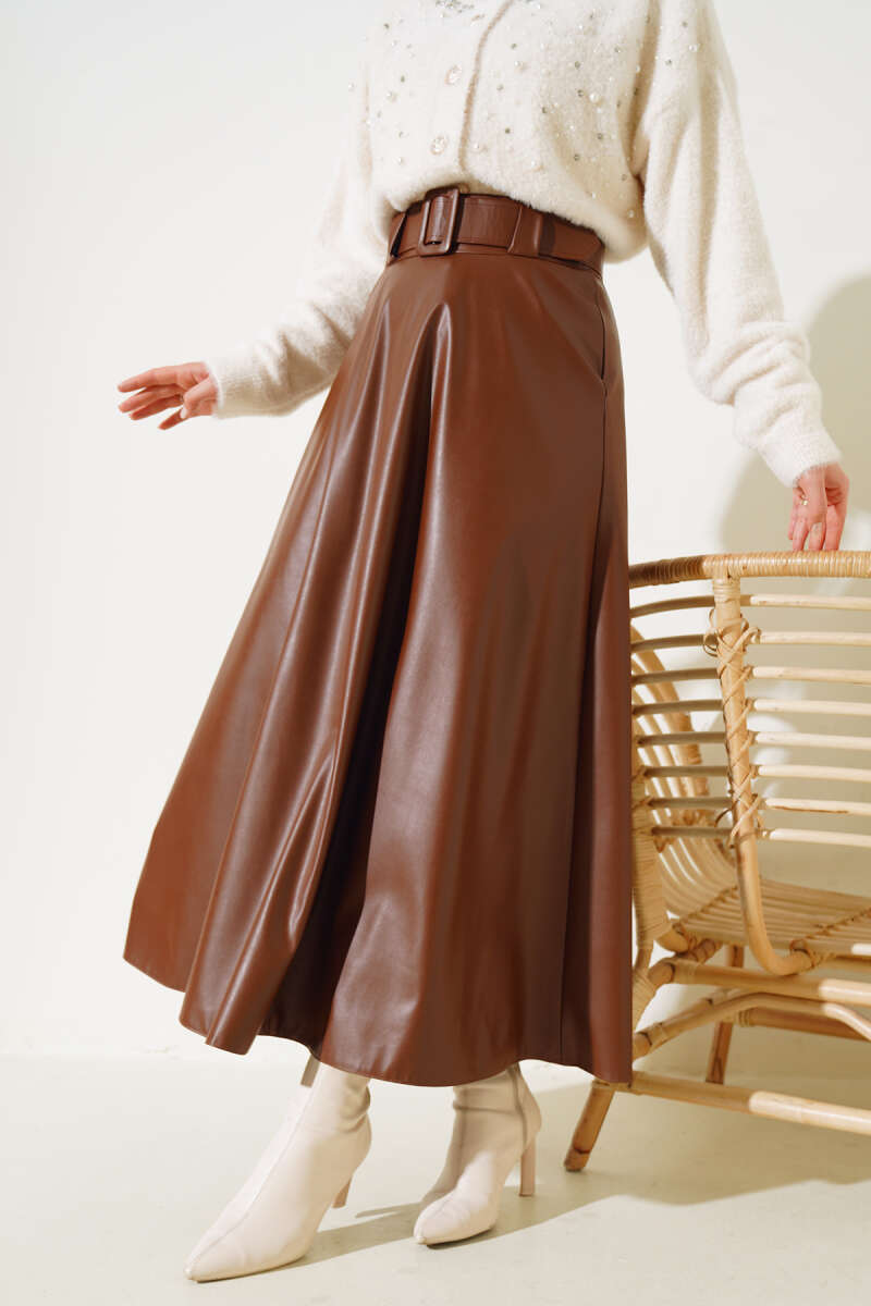 Kemer Aksesuarlı Ekoseli Etek Haki