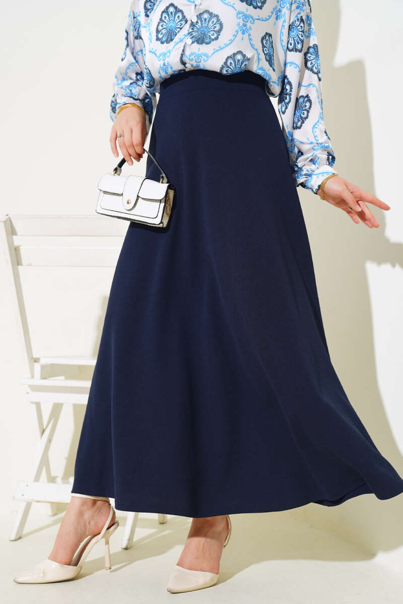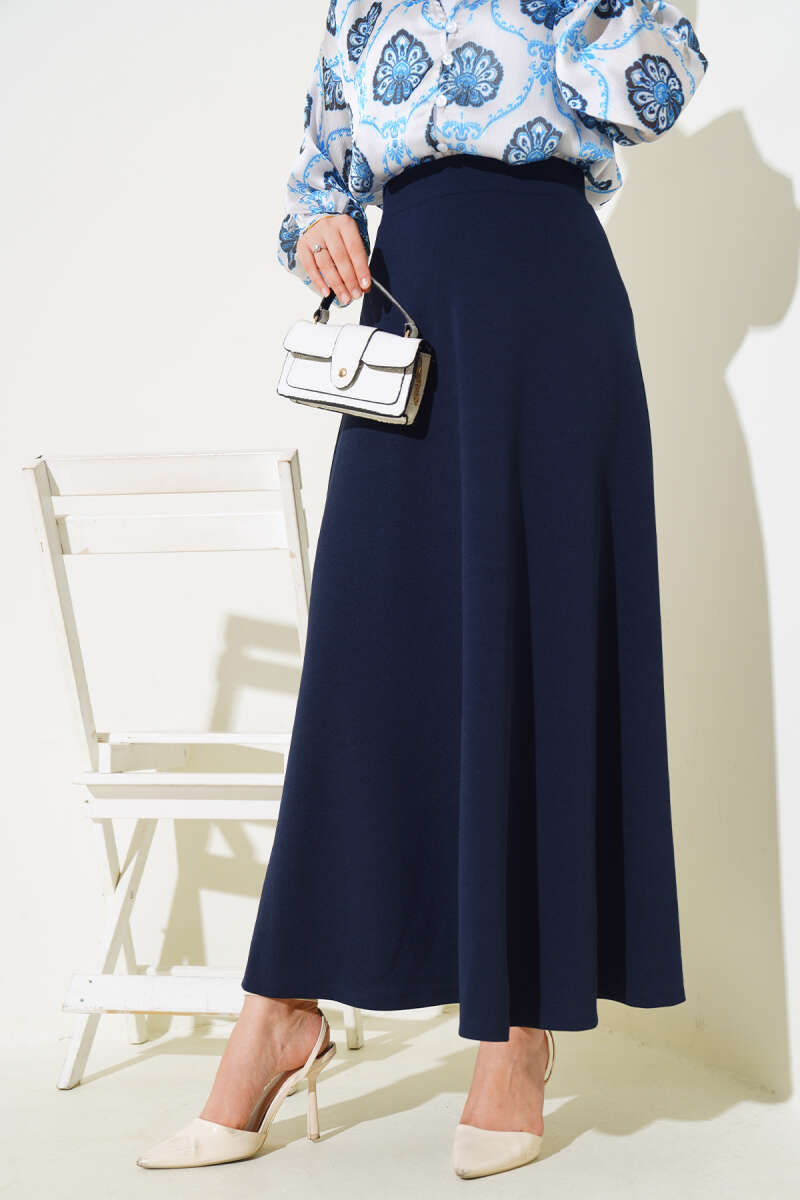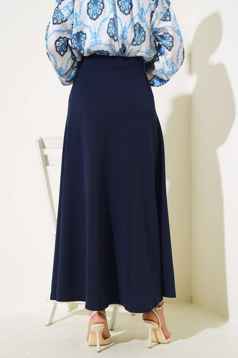 Düz modele sahip olan eteğimiz kloş modeldir. Basic bir parça olup bluz ve ceketlerinizle uyum sağlayacak kombinlenmesi kolay bir parçadır. Eteğimizin beli lastikli ve esnektir. Kemer aksesuar olarak kullanılmıştır.