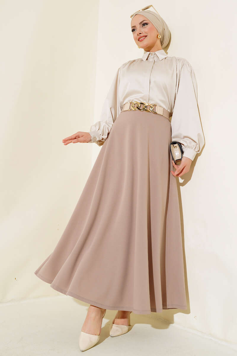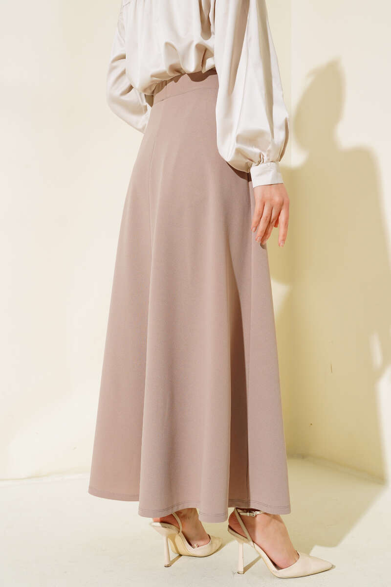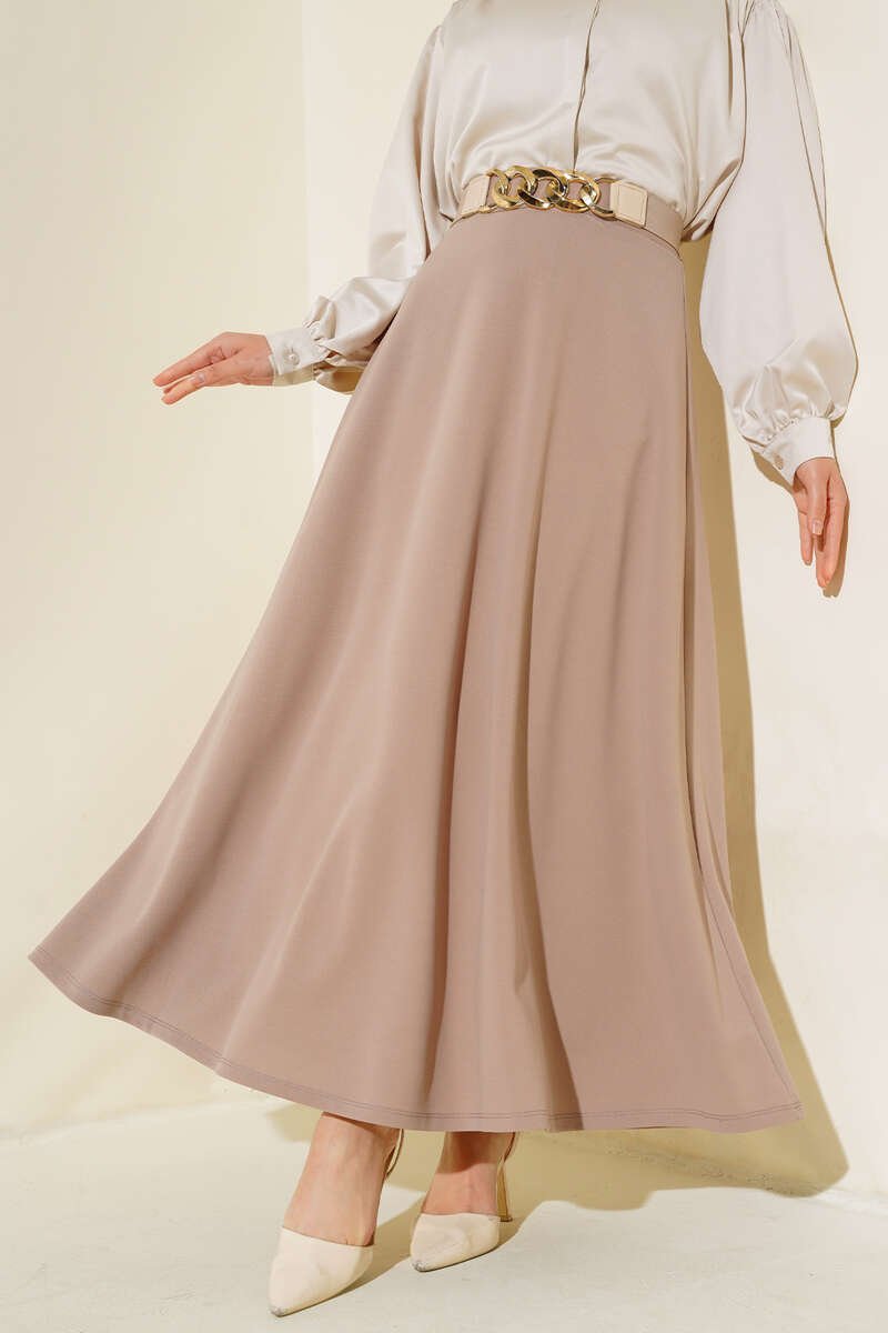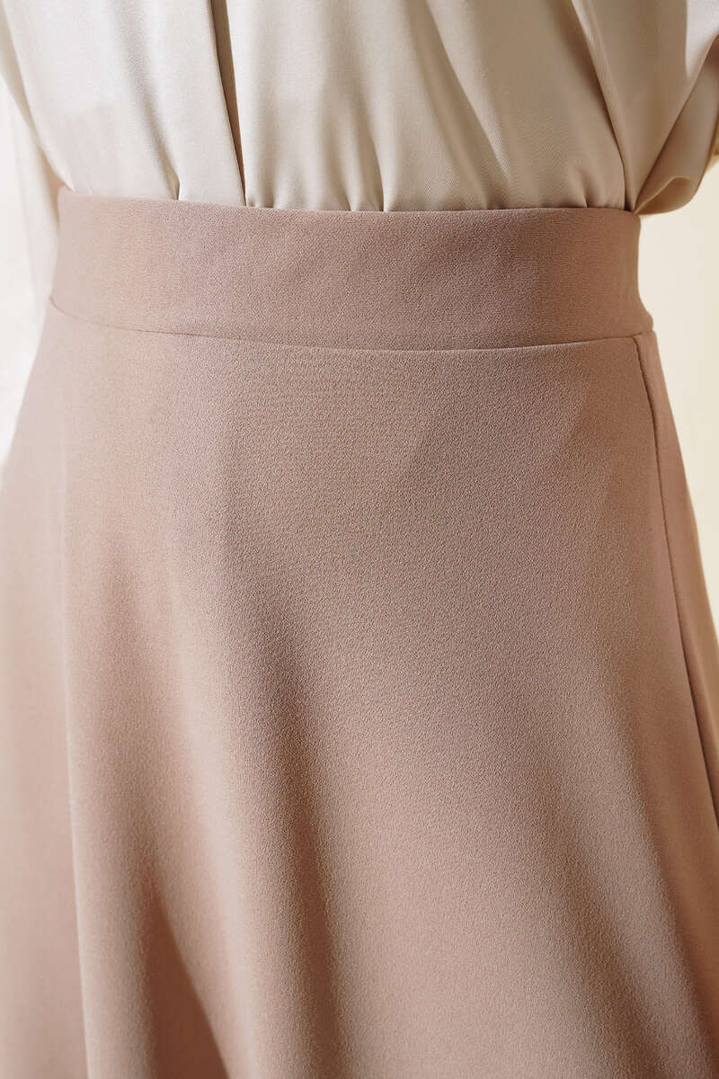 Düz modele sahip olan eteğimiz kloş modeldir. Basic bir parça olup bluz ve ceketlerinizle uyum sağlayacak kombinlenmesi kolay bir parçadır. Eteğimizin beli lastikli ve esnektir. Kemer aksesuar olarak kullanılmıştır.
