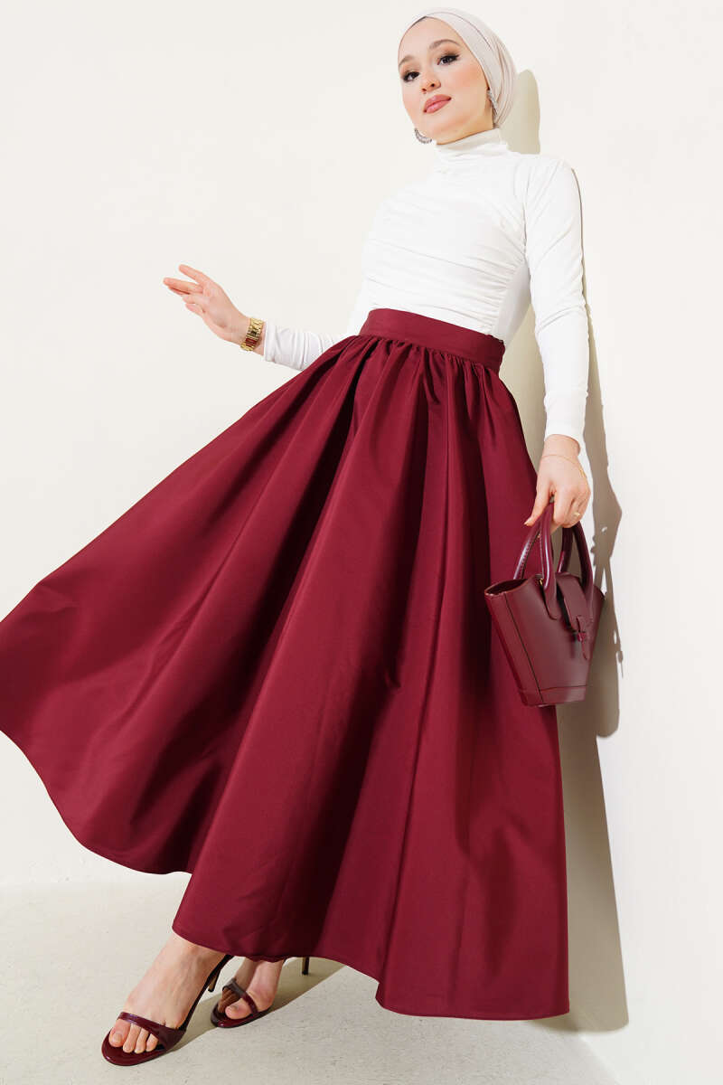 Kemer Aksesuarlı Ekoseli Etek Bordo