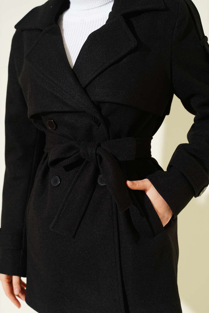 Kruvaze Gold Düğmeli Kaşe Kaban Siyah