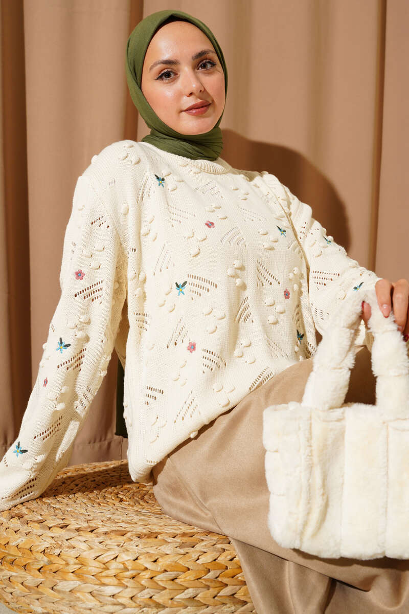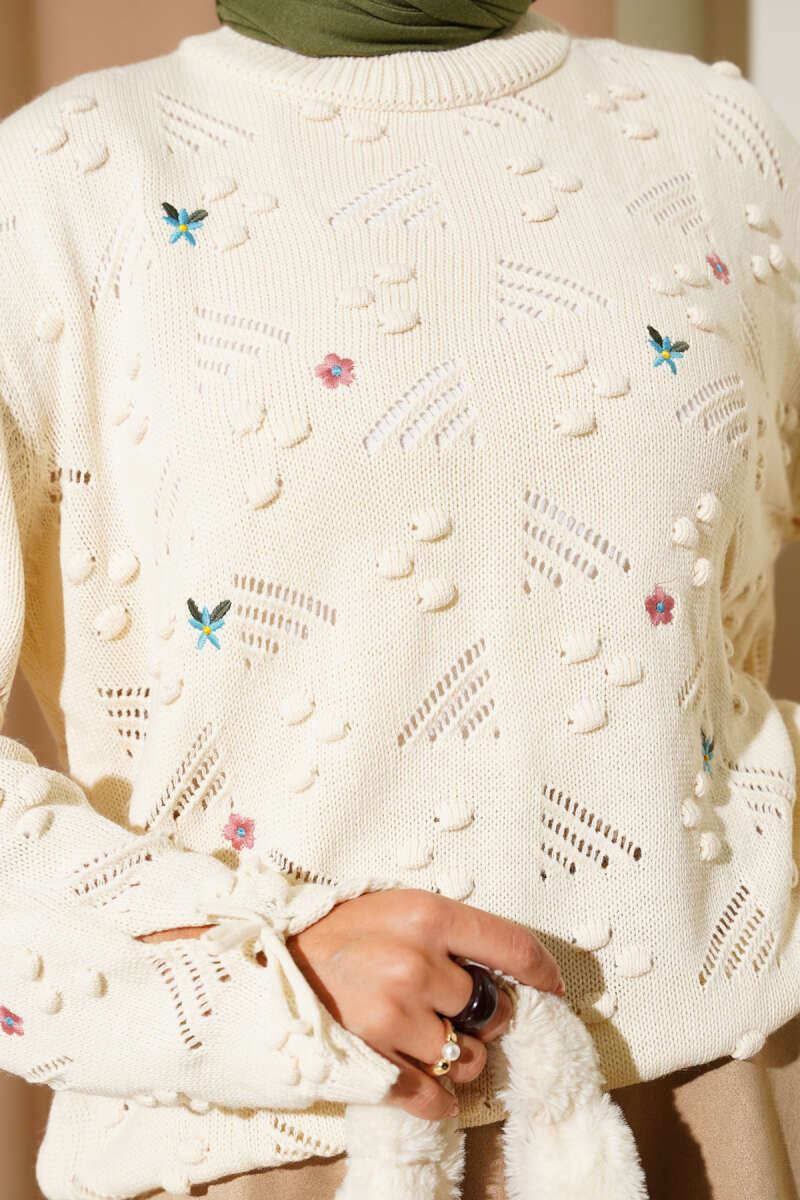 Kol Bağcıklı Çiçek Nakışlı Triko Kazak Ekru