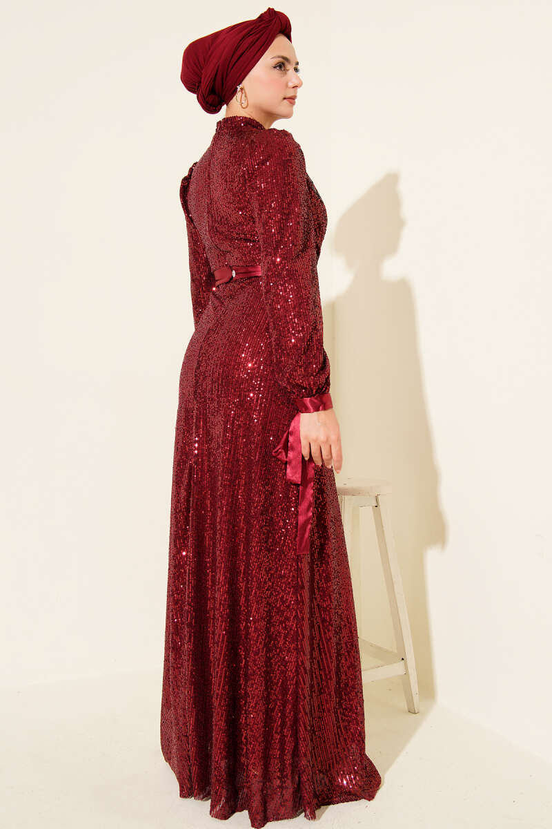 Sıra Taşlı Balon Kol Abiye Elbise Bordo