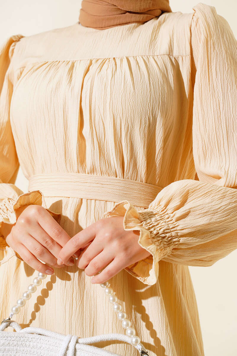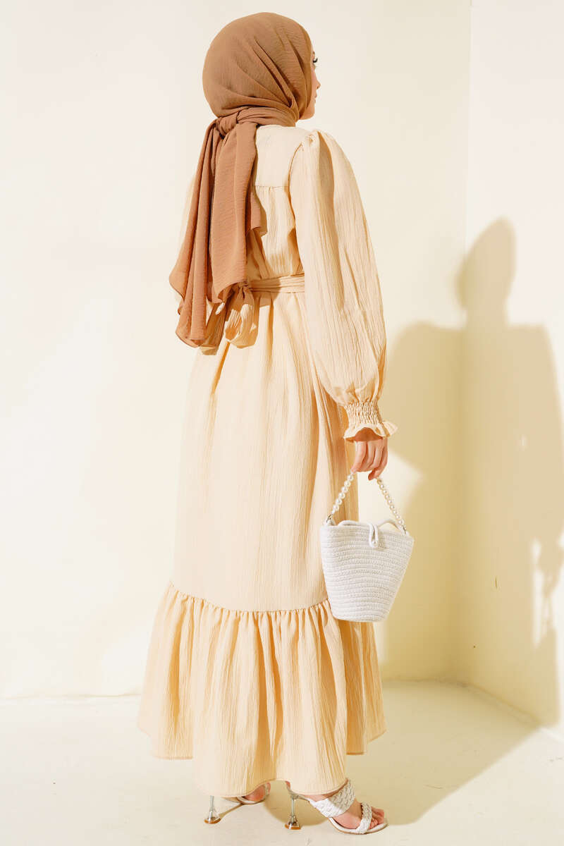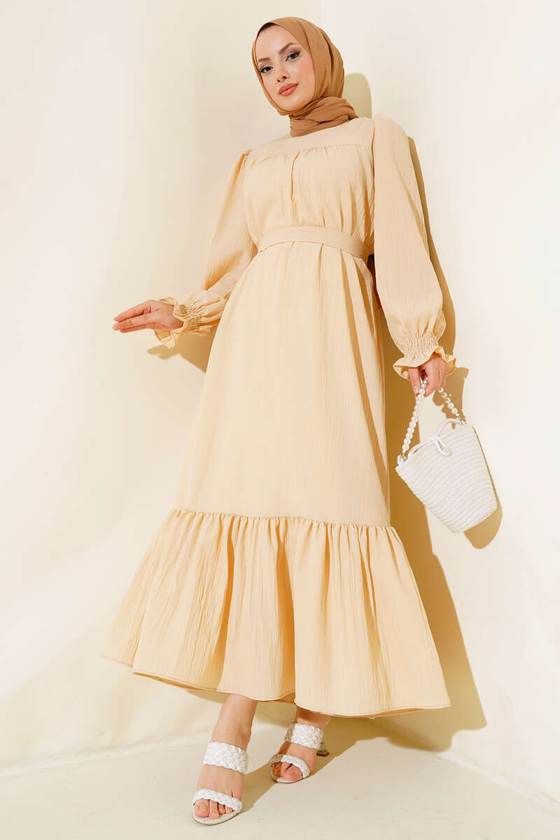 Yeni sezon elbise modelimiz sizlerle beraber. Elbisemizin kol bilekleri gipelidir. Oval yakadır. Enseden düğmelidir. Kat modeldir. Elbisemiz kloş modeldir. Astarsızdır. Kendi kumaşından kuşağı vardır. Renk seçenekleri olan elbise modelimiz dolabınızda yerini beklemektedir.