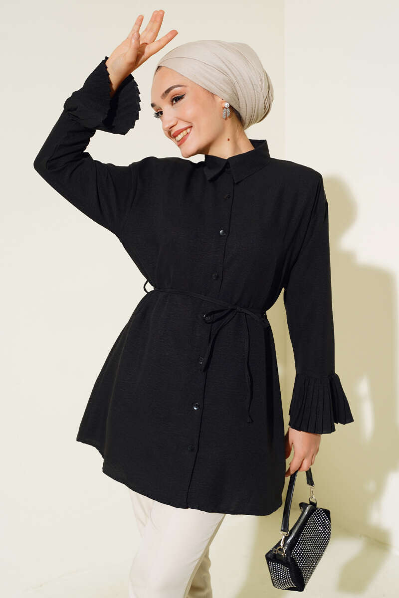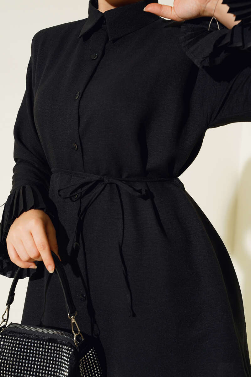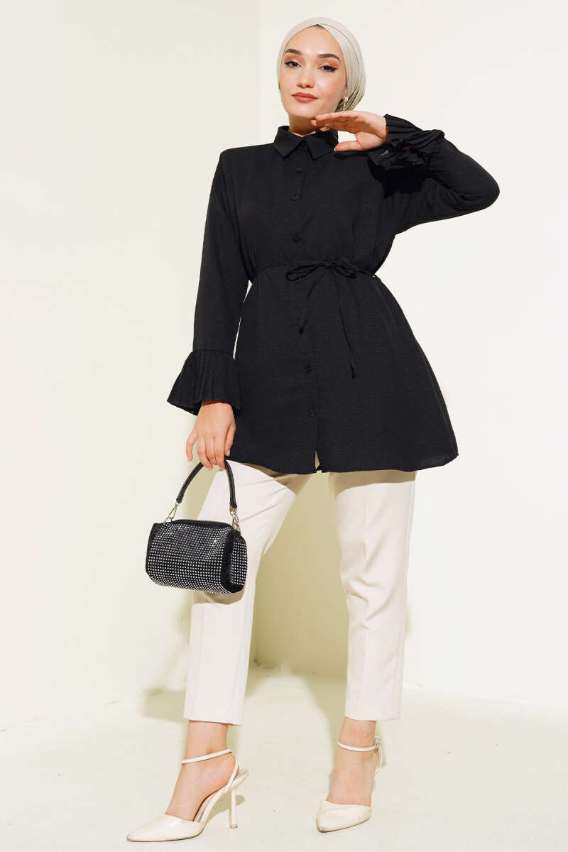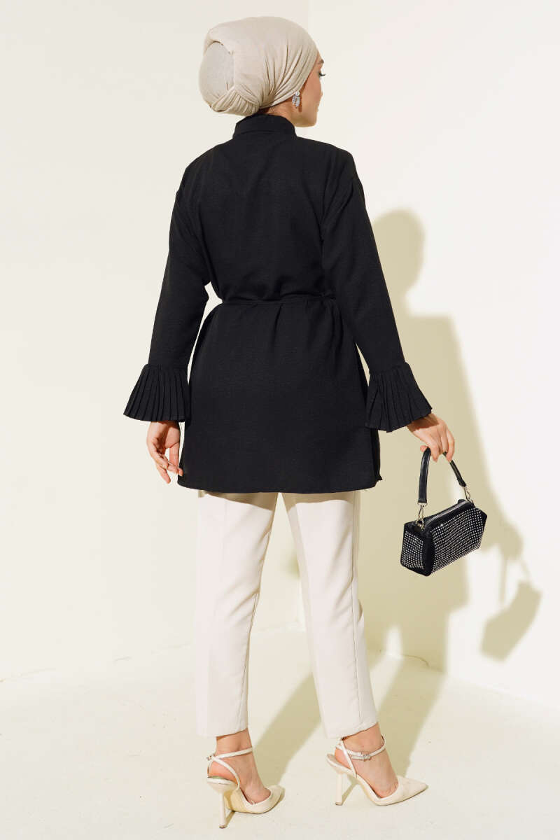 Gömlek Yaka İp Kuşaklı Deri Ceket Siyah