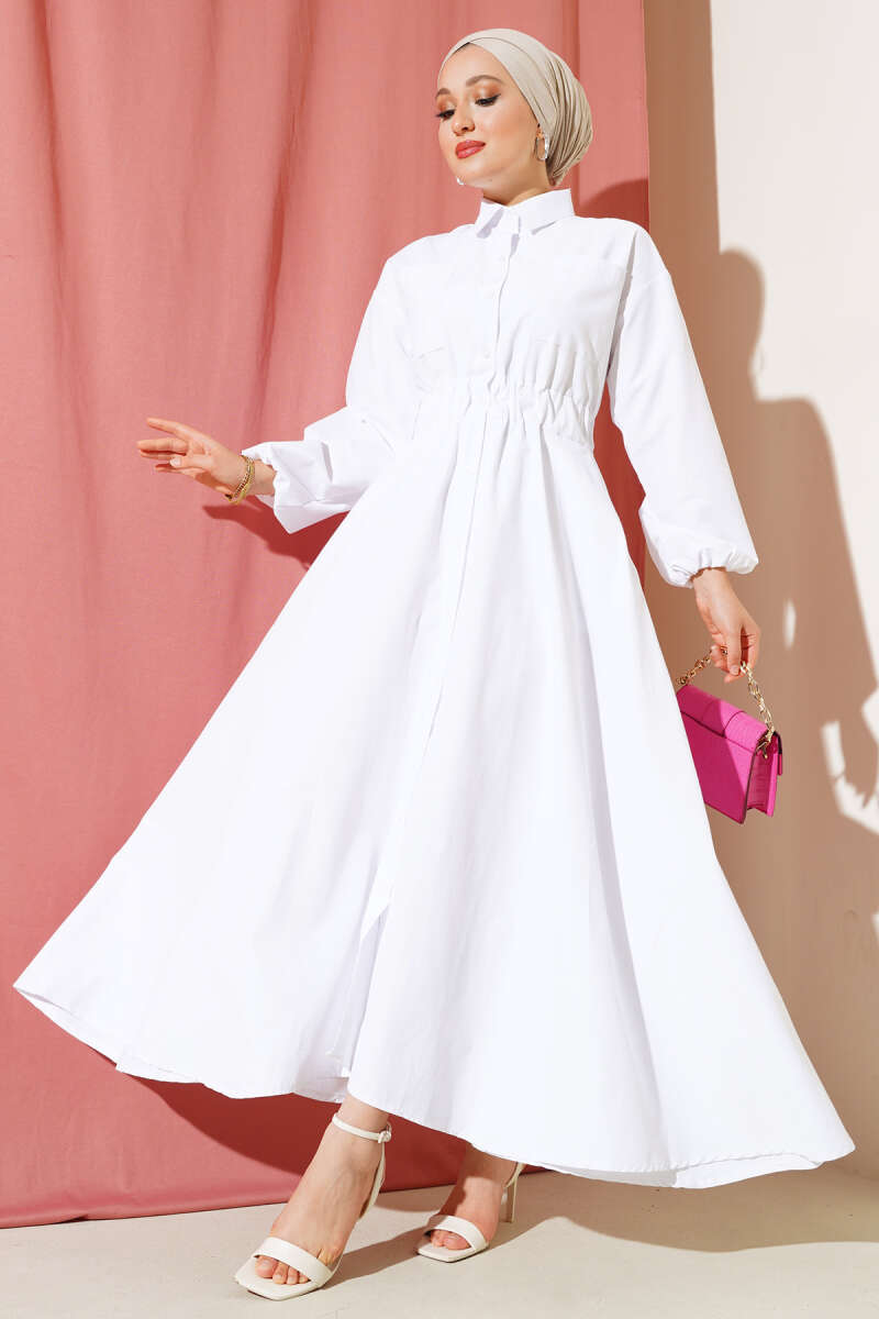 Desenli Yarım Düğmeli Elbise Beyaz Saks