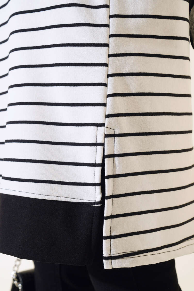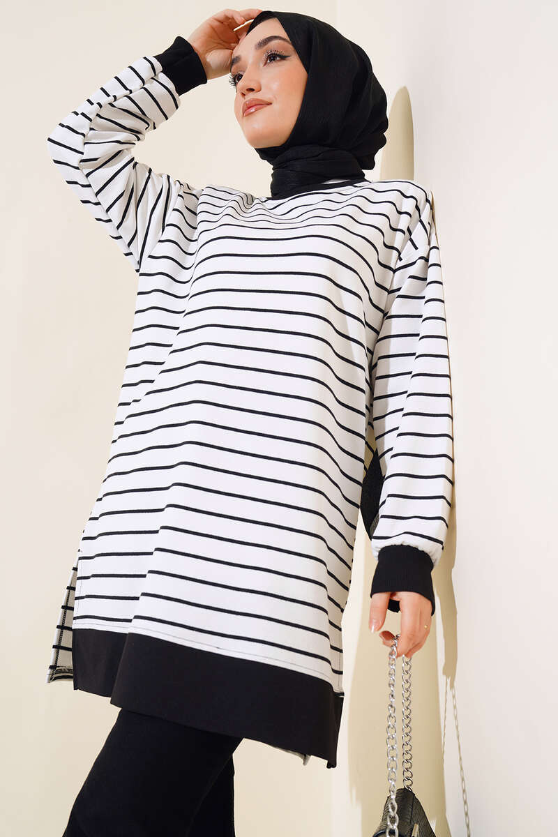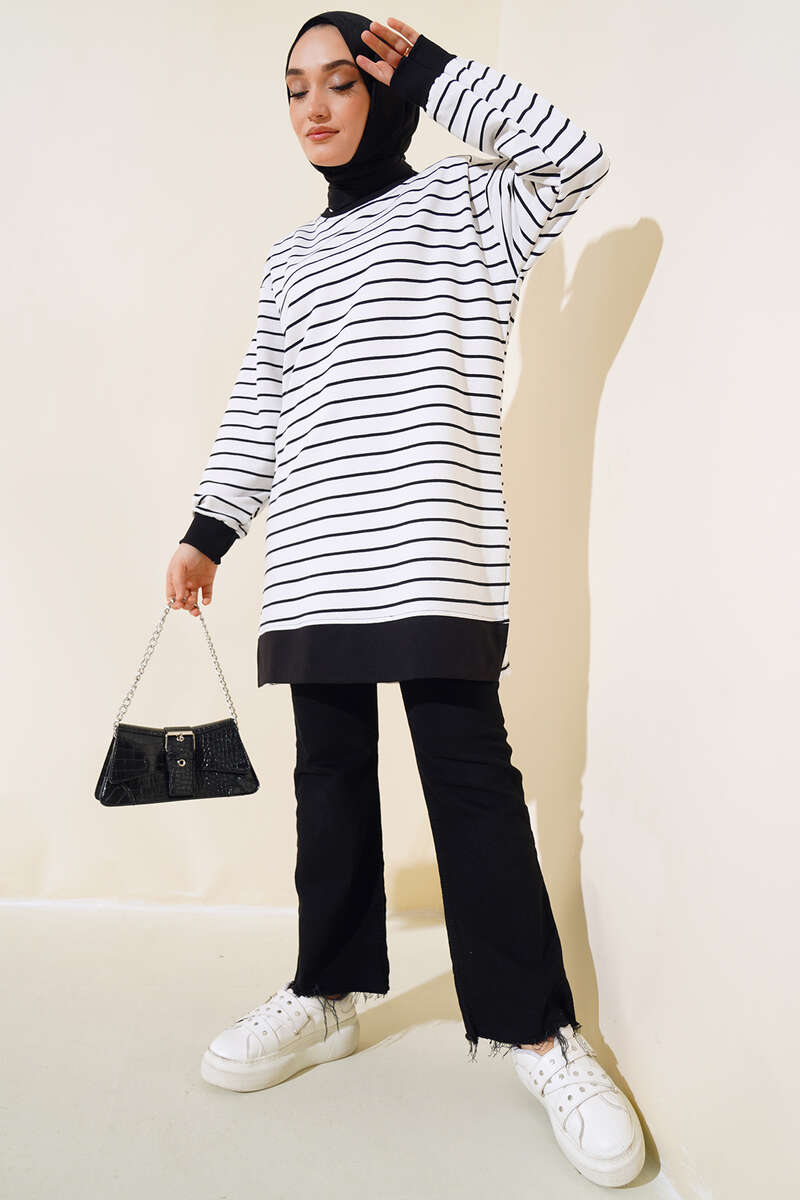 Kol Bilekleri Ribanalı Çizgili Tunik Beyaz