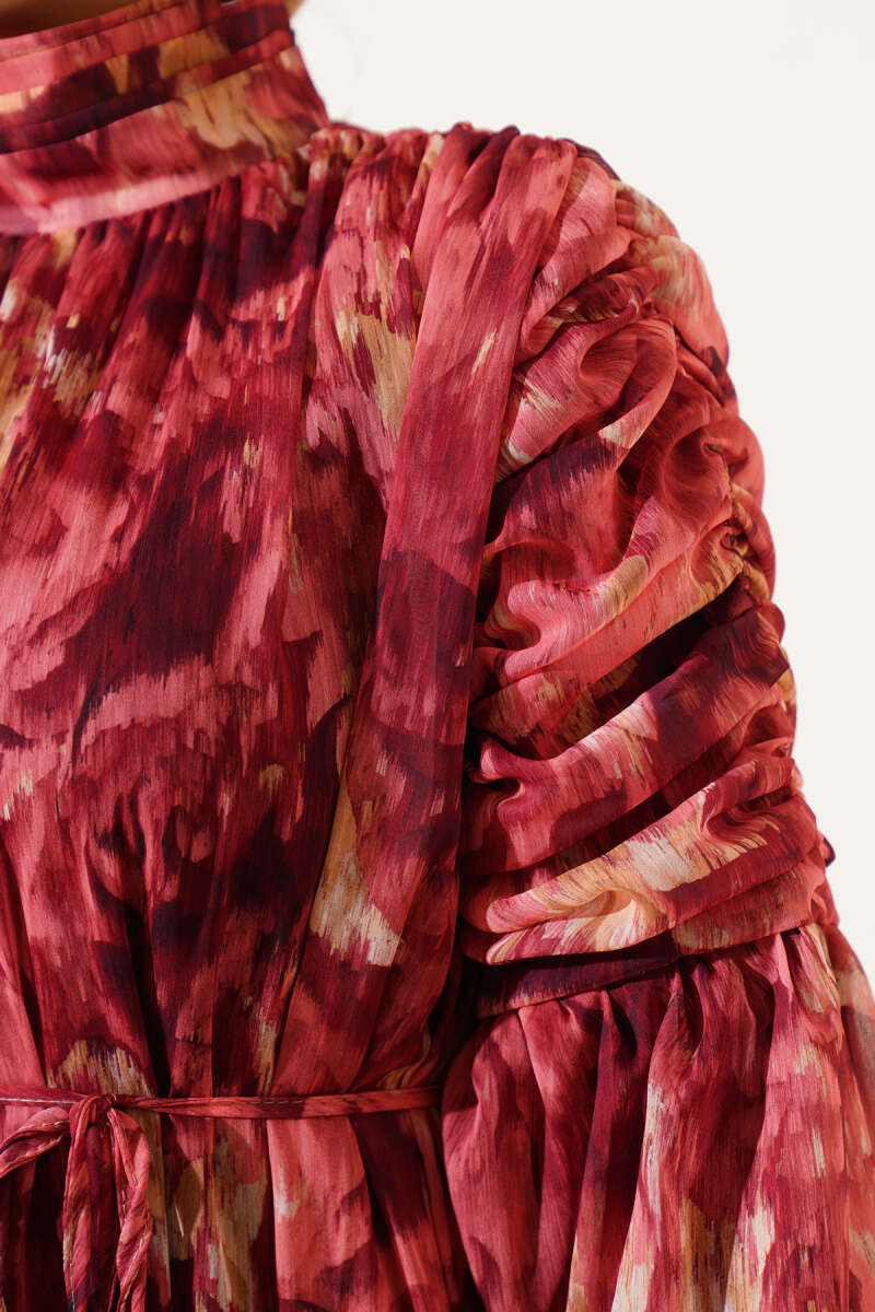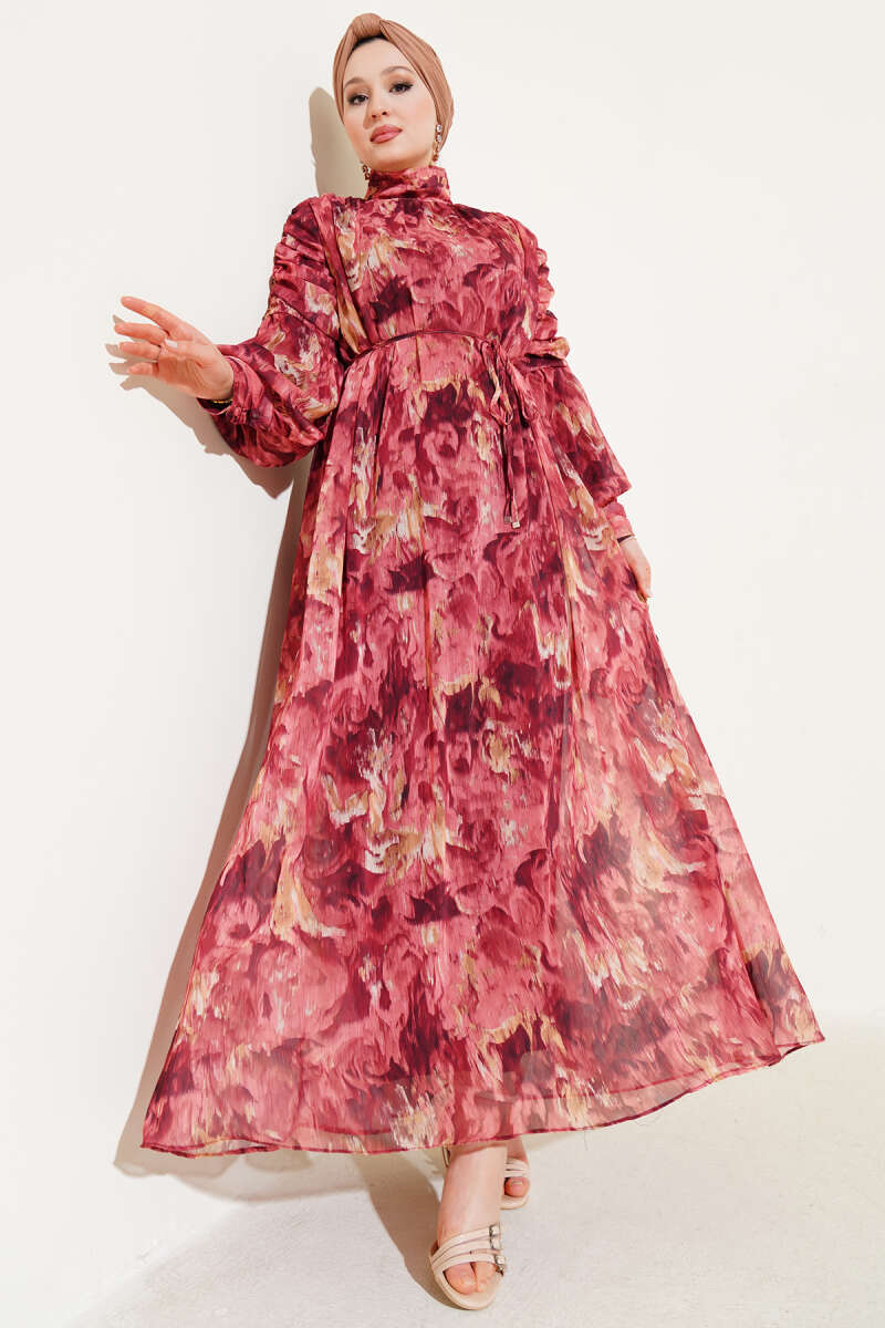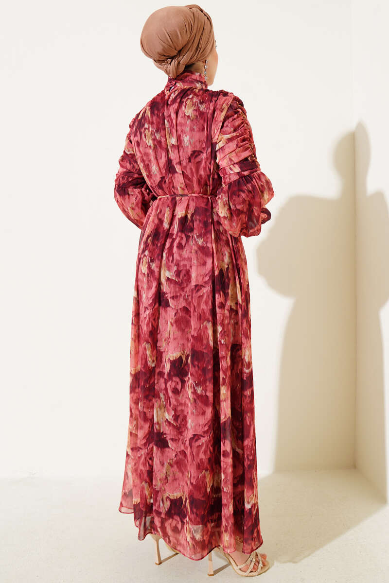 Kol Büzgülü Karışık Desen Şifon Elbise Gül Kurusu
