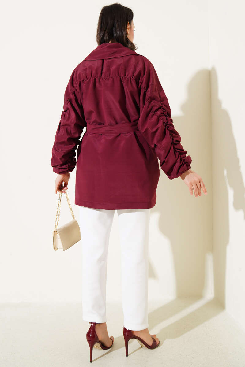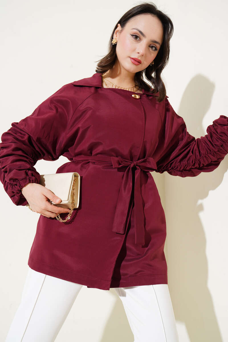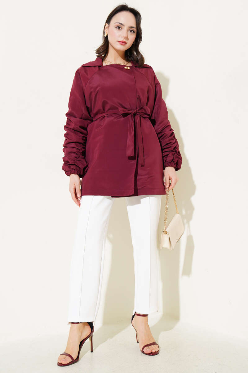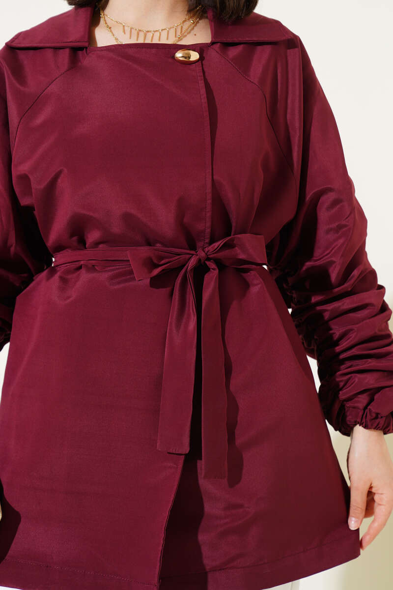 Kruvaze Yaka Kuşaklı Kaşe Ceket Bordo