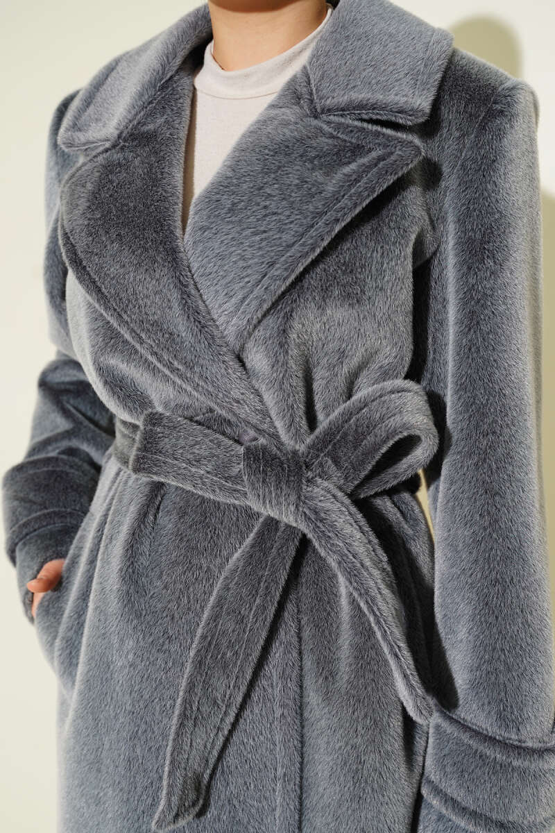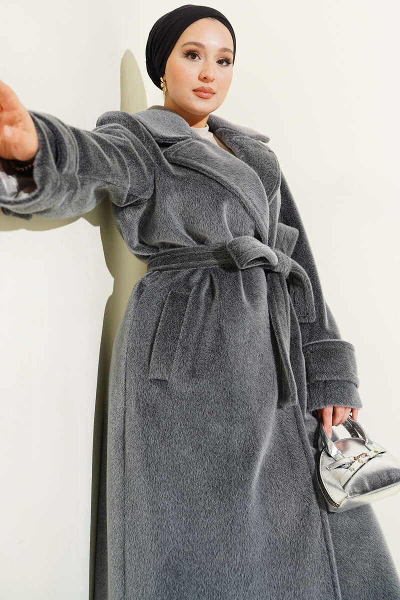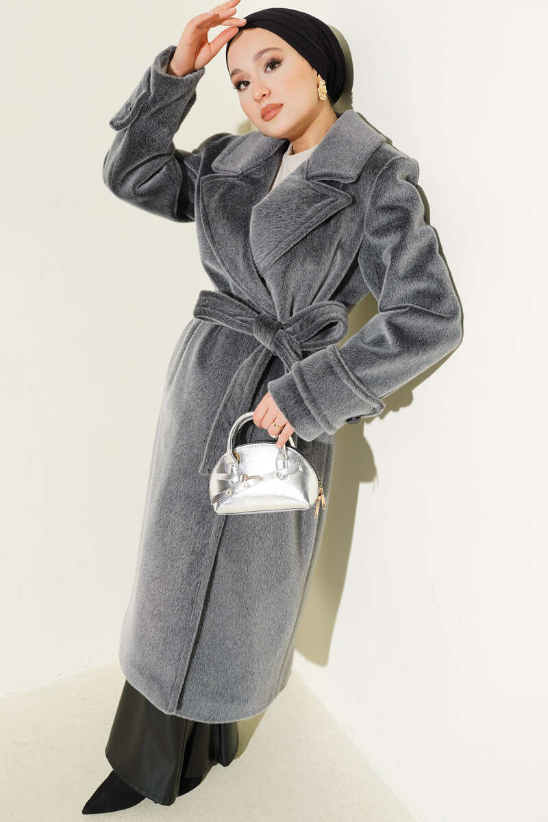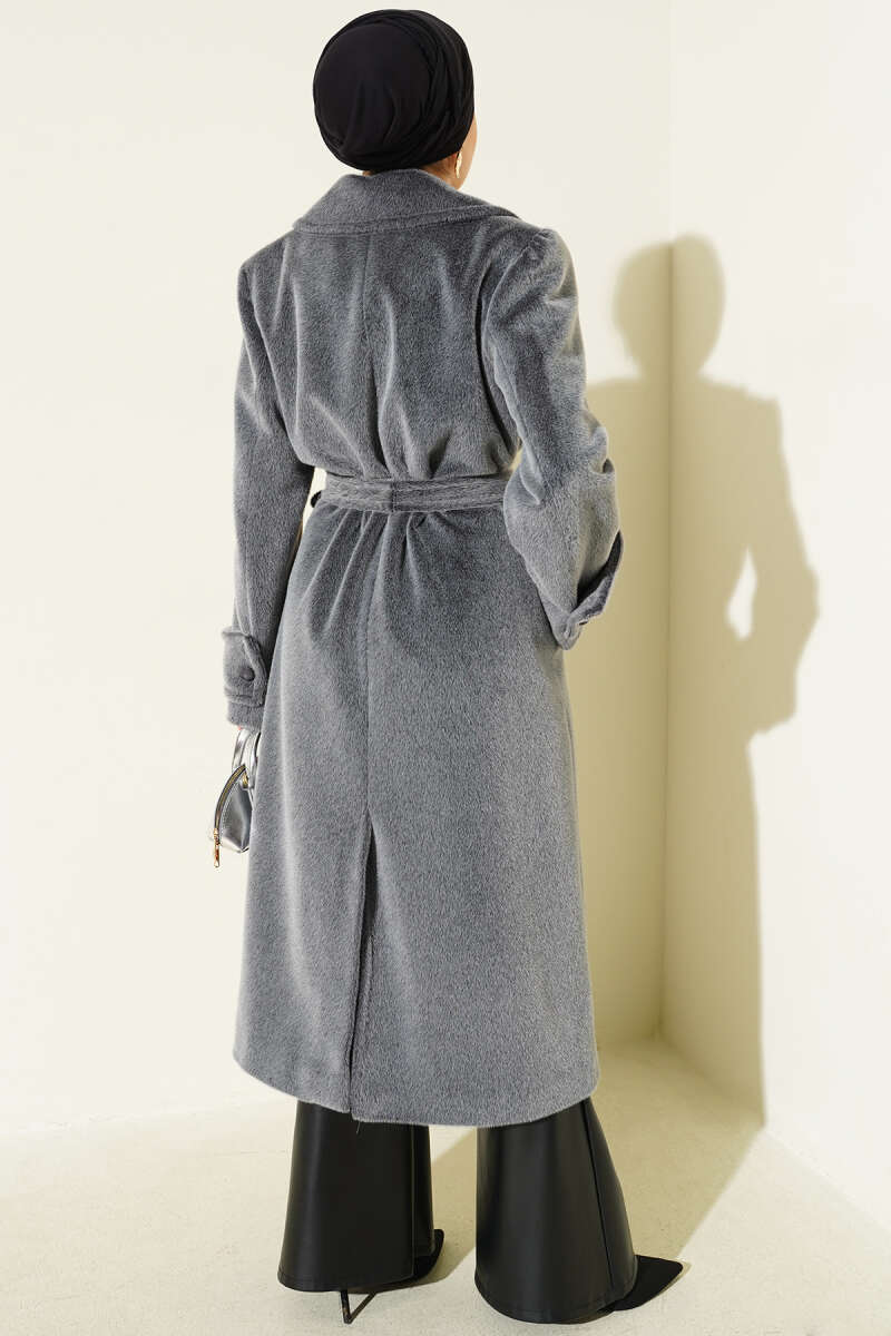Bilek Düğmeli Kuşaklı Kaşe Kaban Gri