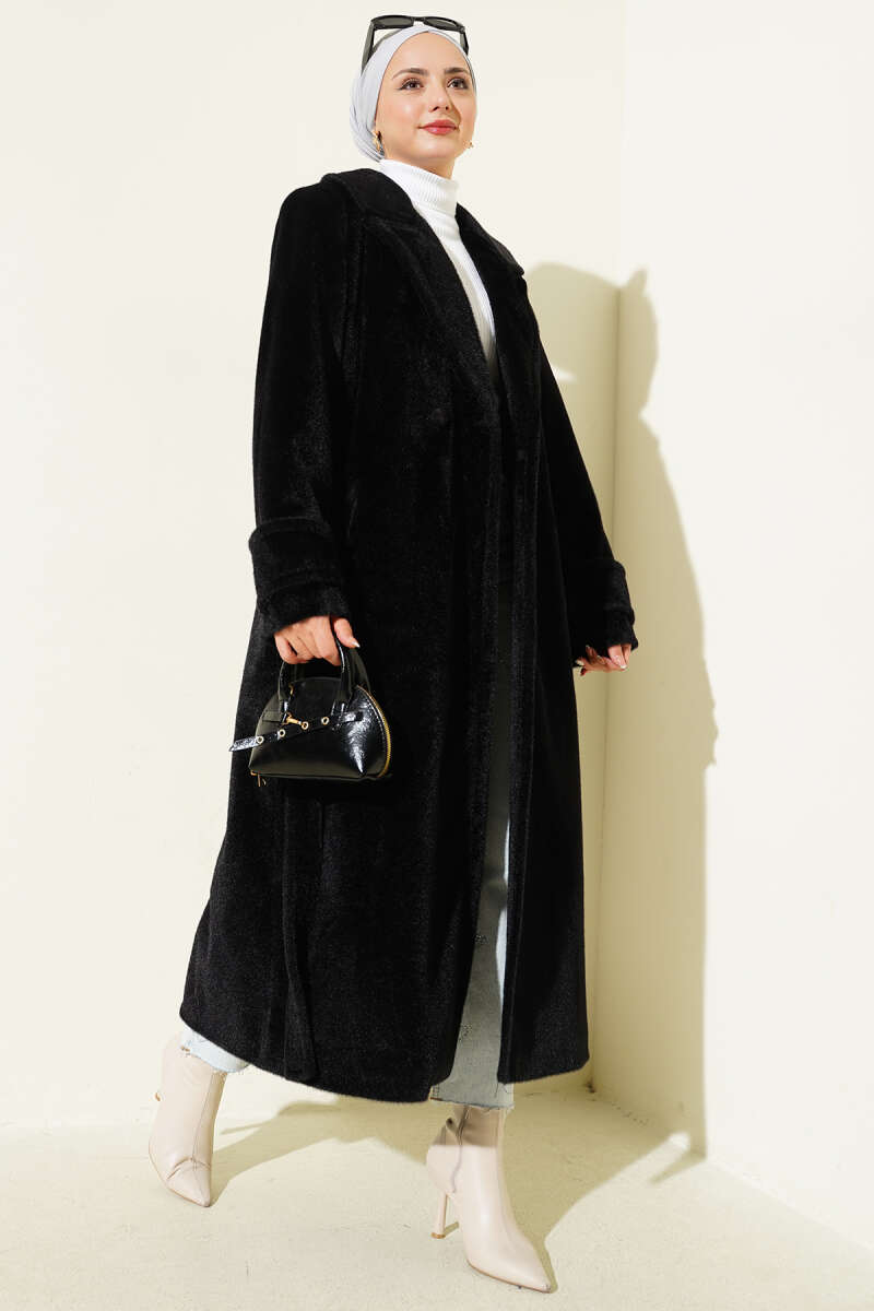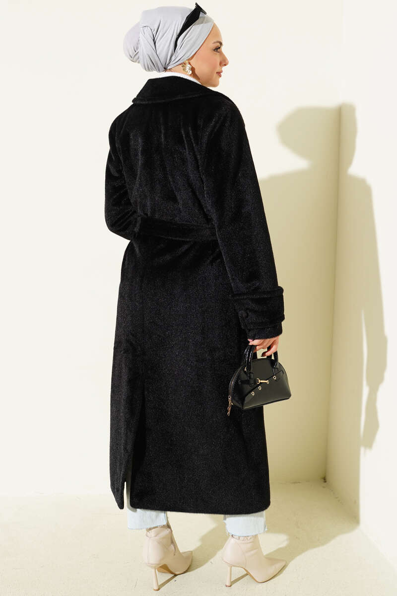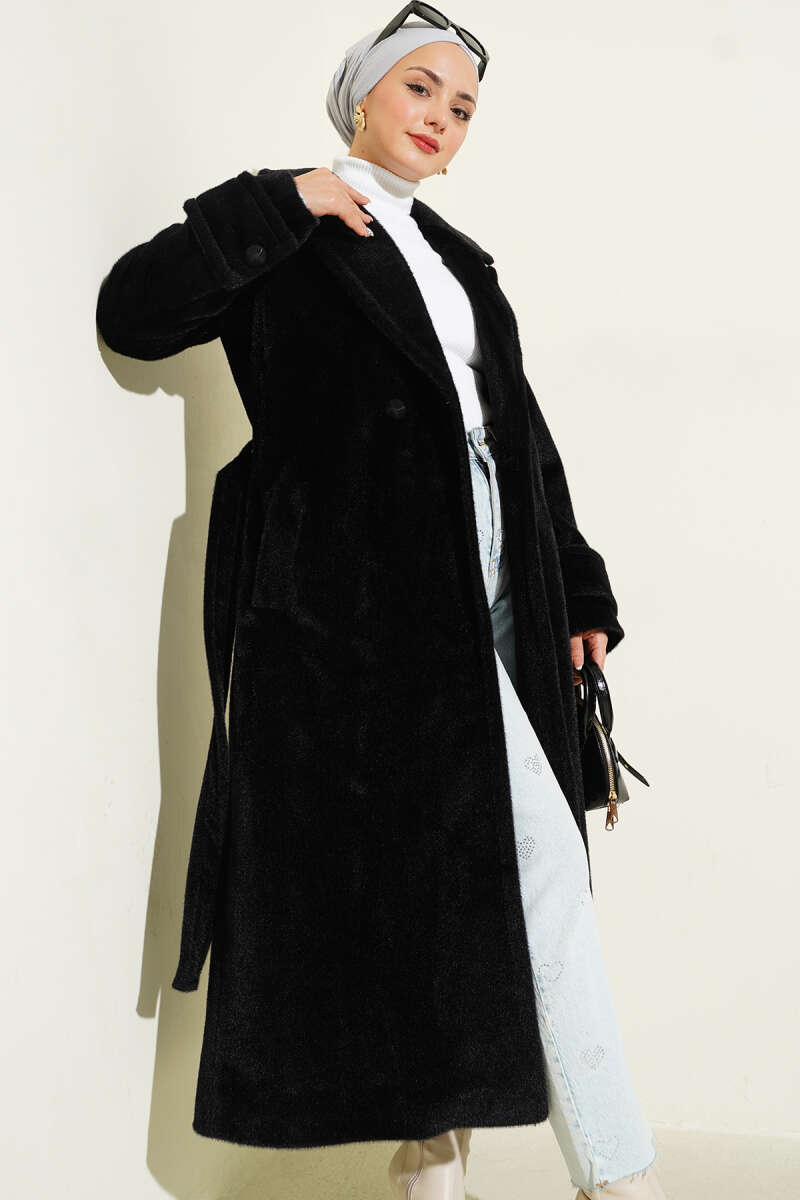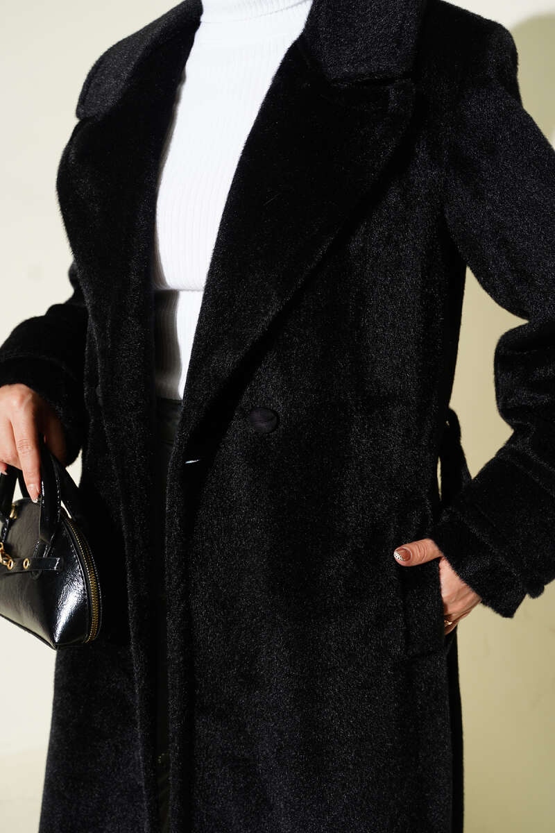 Kuşaklı Düğmeli Kaşe Kaban Siyah
