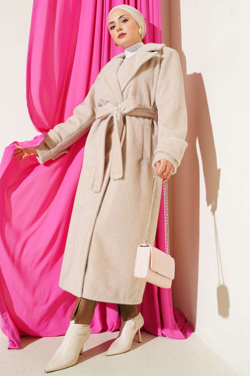 Kuşaklı Gold Düğmeli Kaşe Kaban Taba