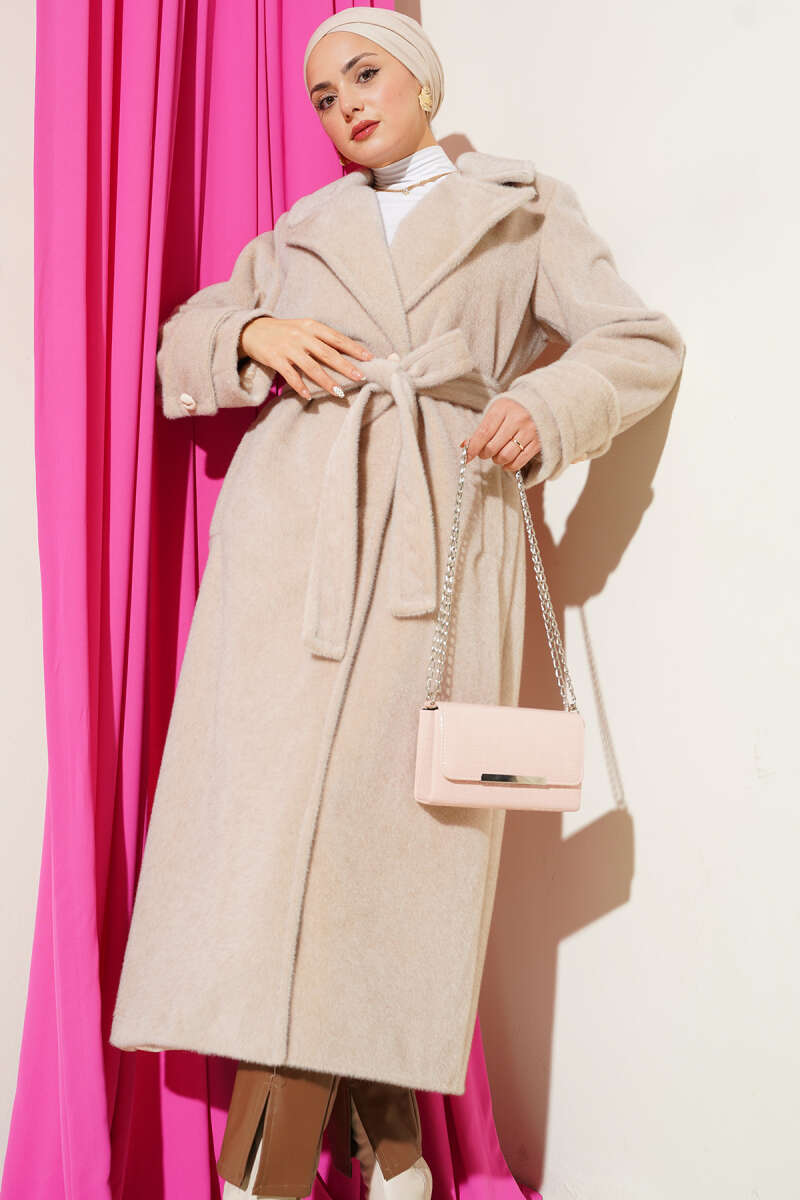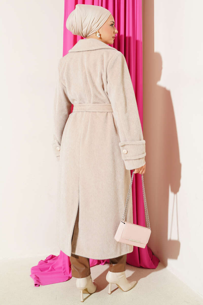 Kruvaze Yaka Altı Düğmeli Kaşe Kaban Latte