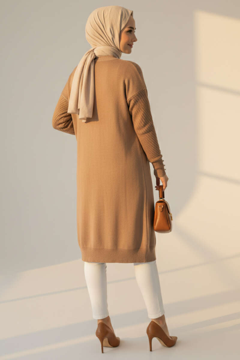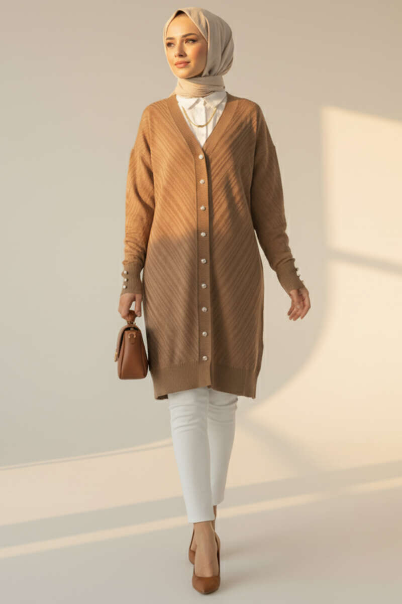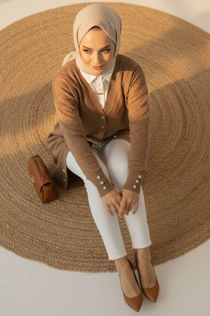 Şal Yaka Pirinç Örgü Triko Hırka Kahve