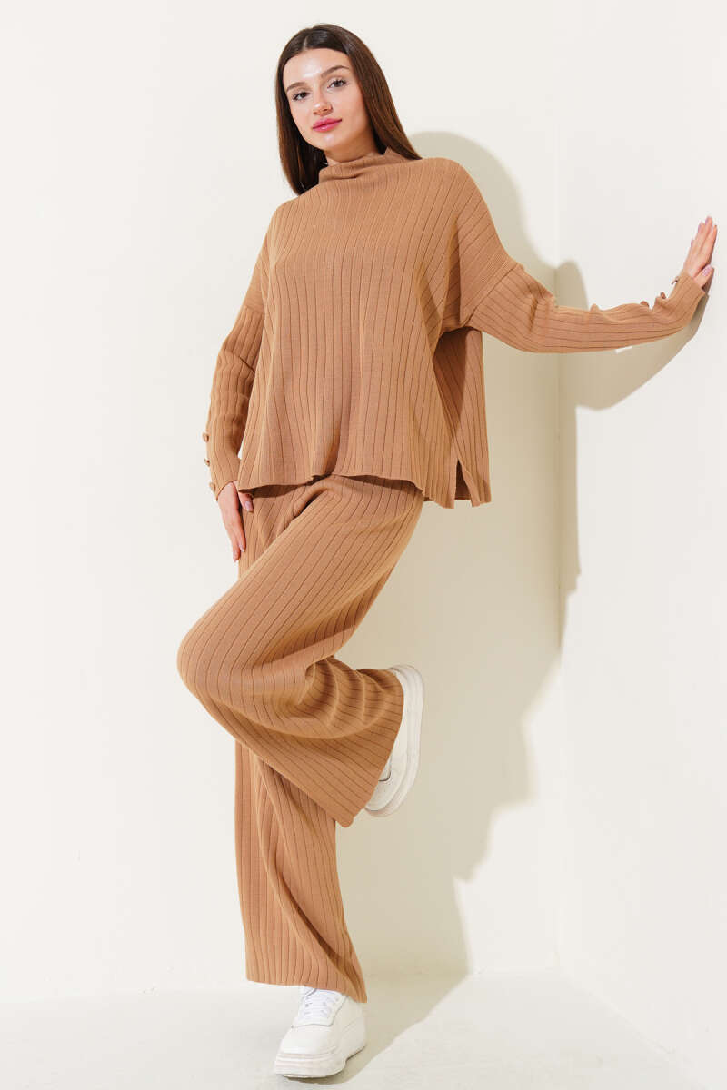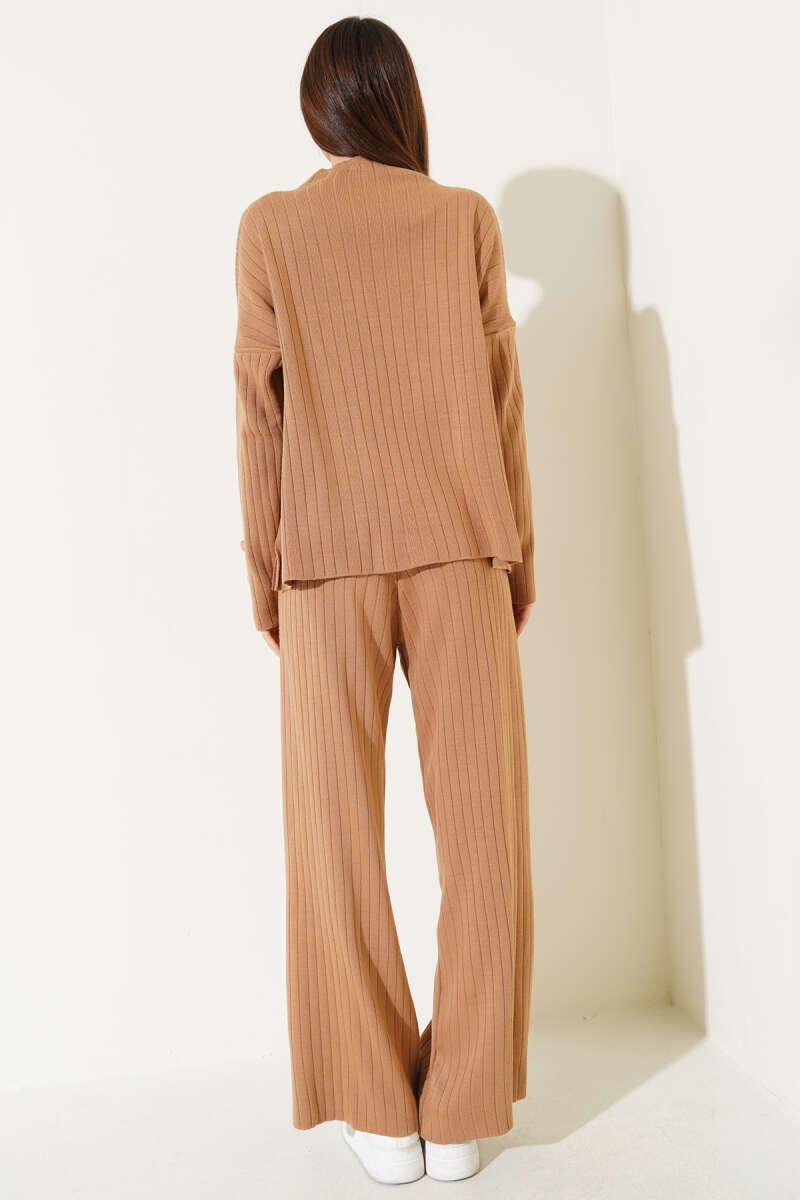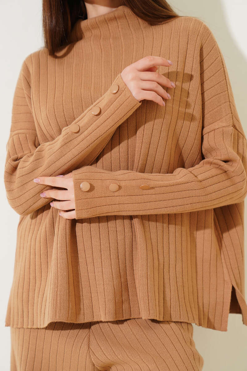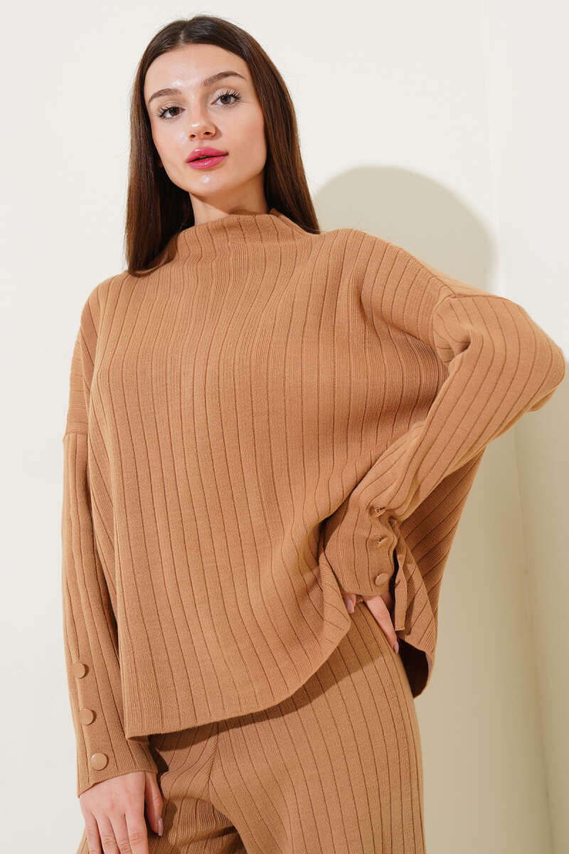 Çizgi Kabartmalı Triko Kazak Yağ Yeşili