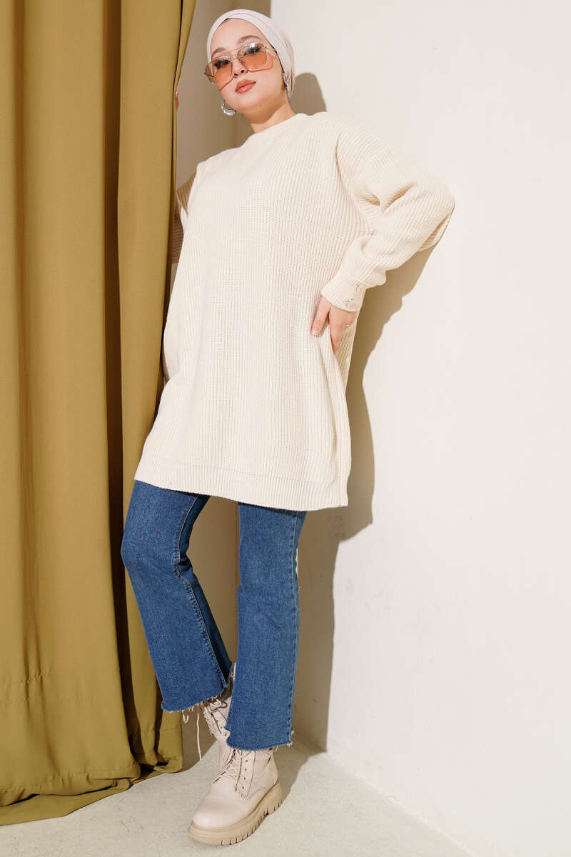 Bisiklet Yaka Yatay Çizgili Triko Tunik Taş