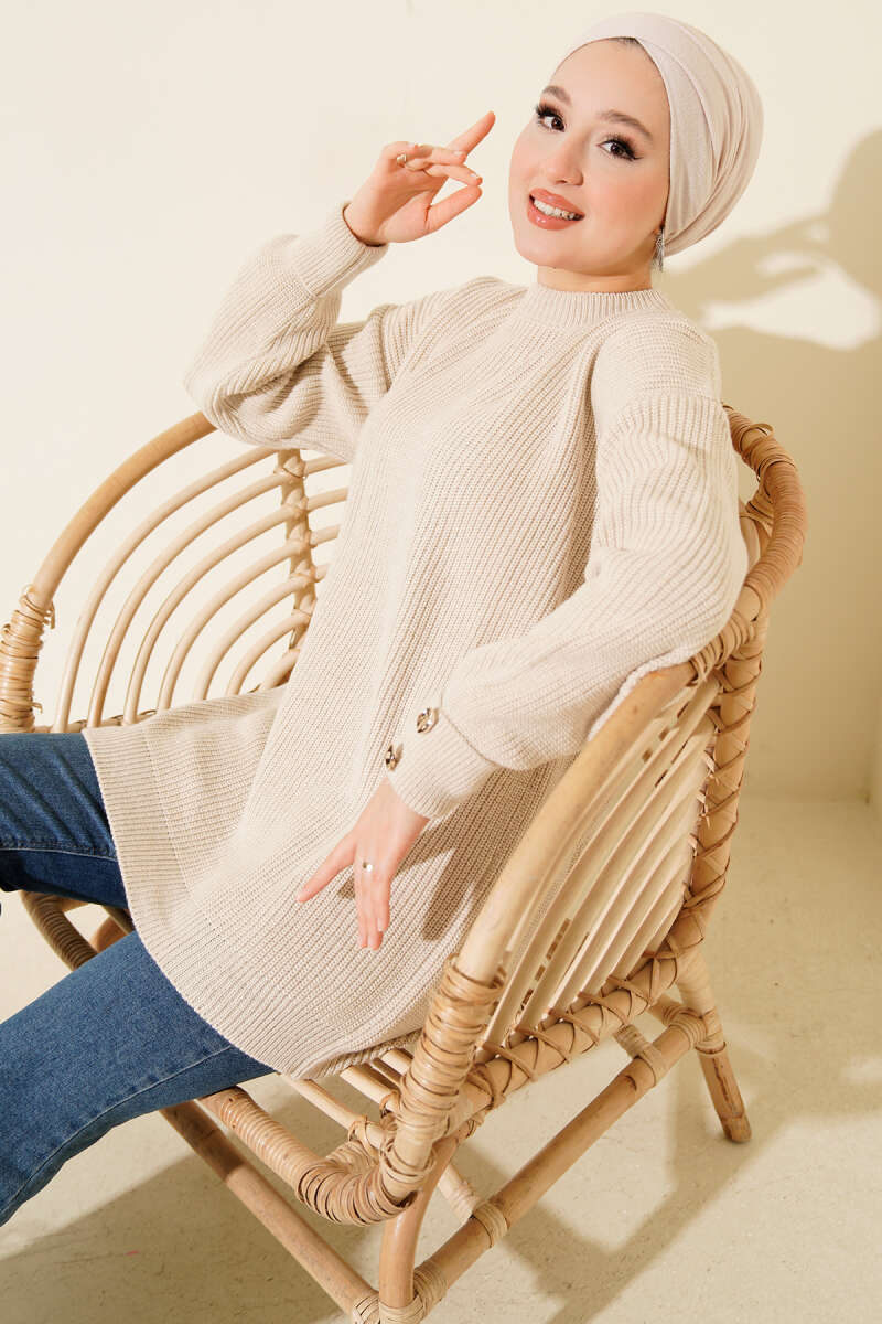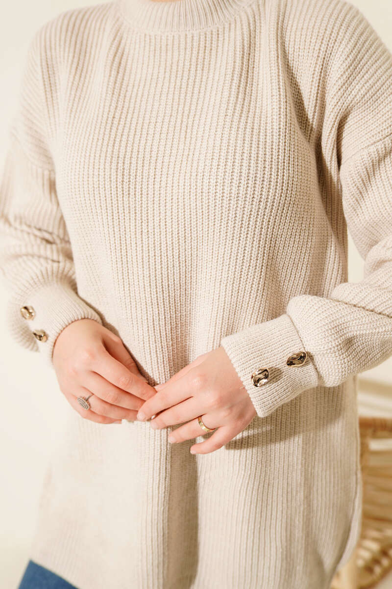 Yatay Çizgi Detaylı Triko Tunik Latte