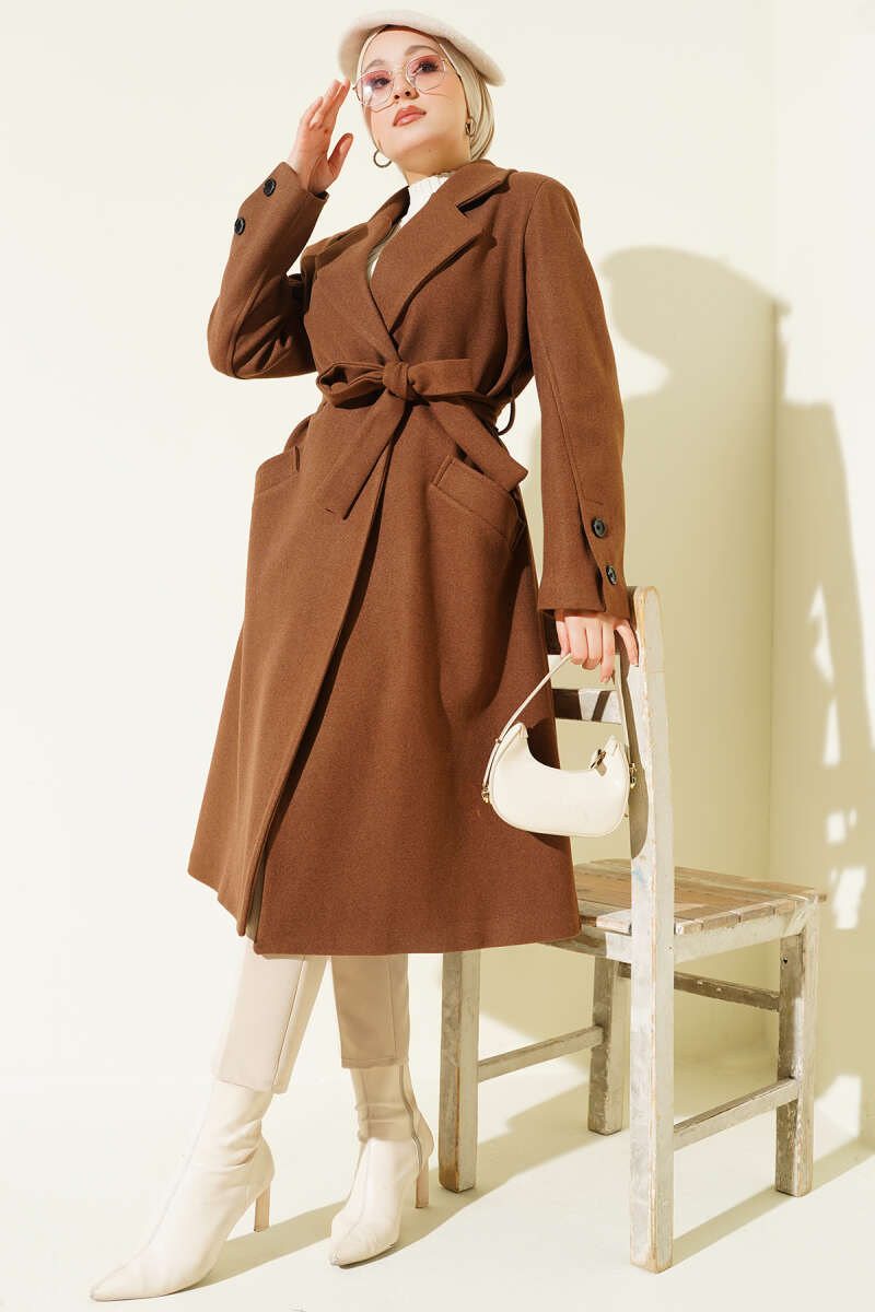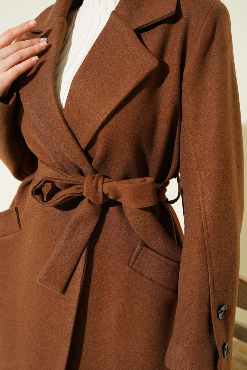 Kol Düğmeli Kuşaklı Kaşe Kaban Vizon