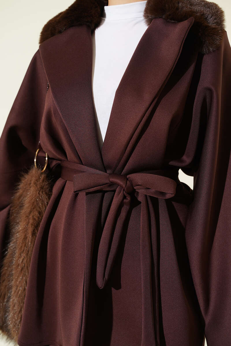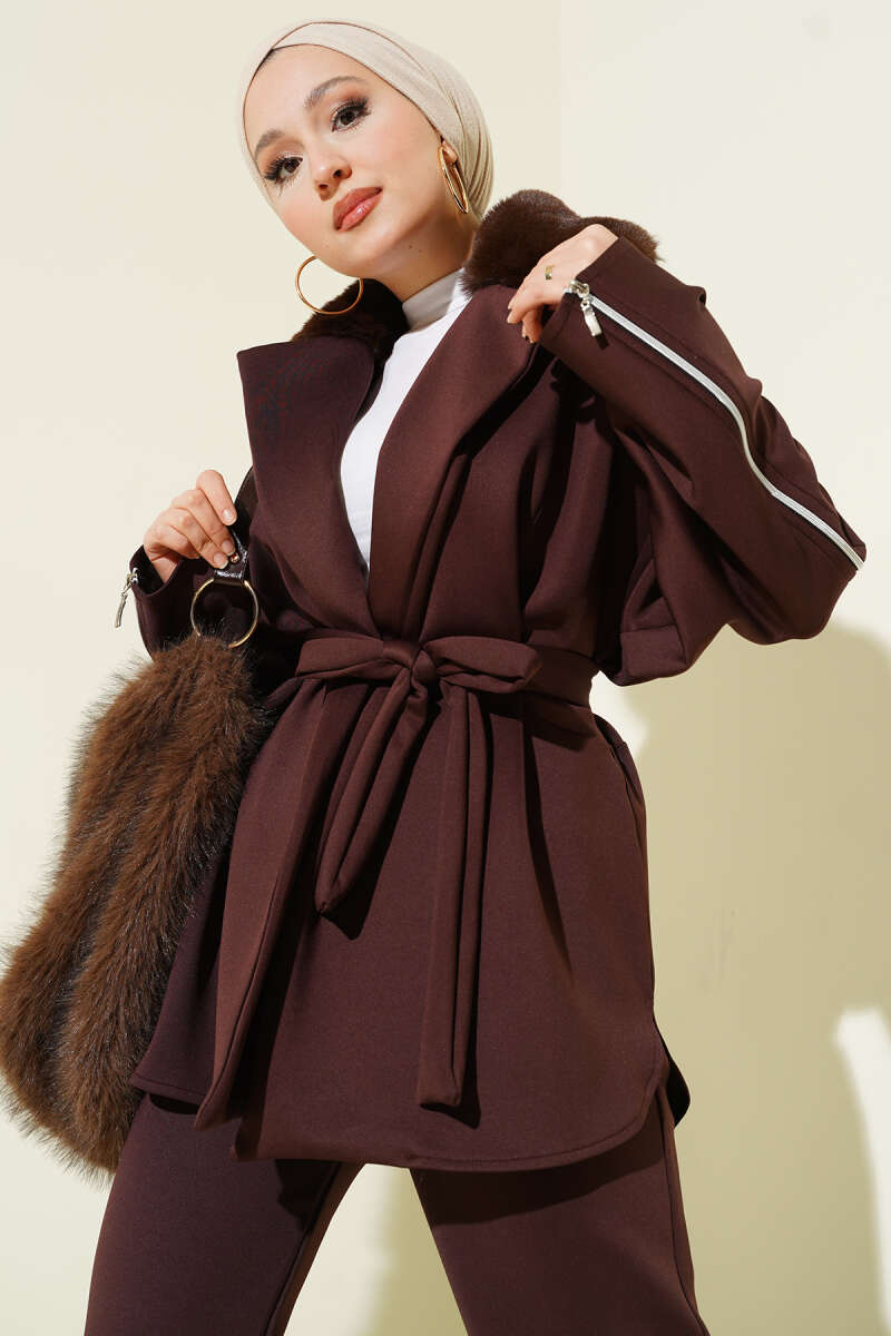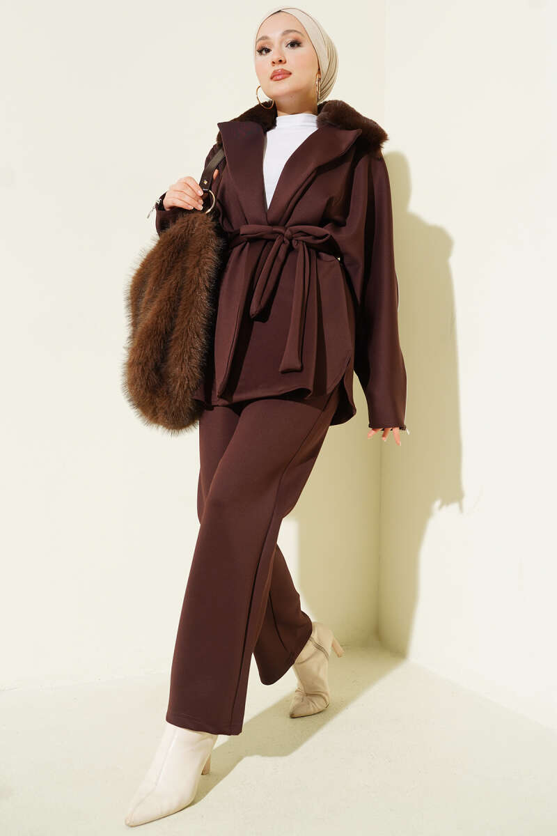 Bel Pensli Kuşaklı Loyşa Etekli İkili Takım Kahve