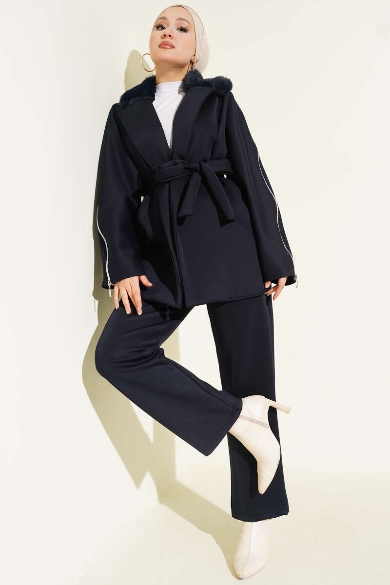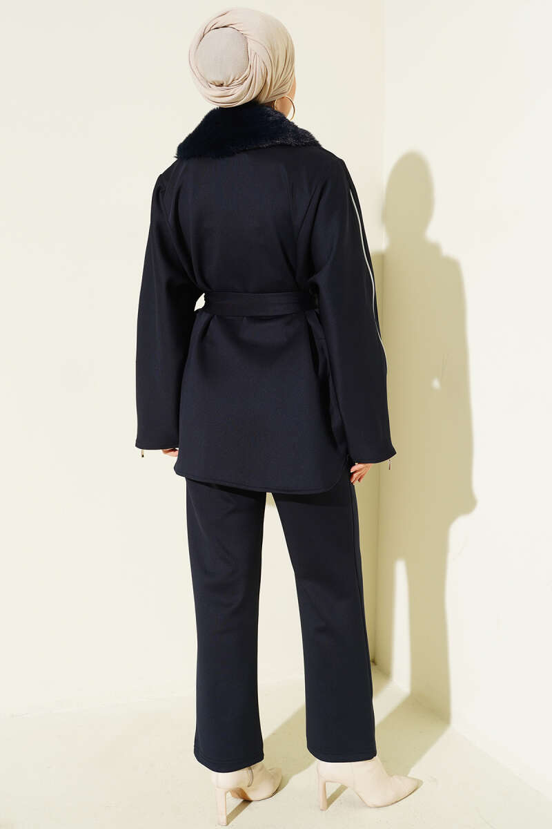 Kol Fermuarlı Yaka Kürklü Scuba İkili Takım Siyah