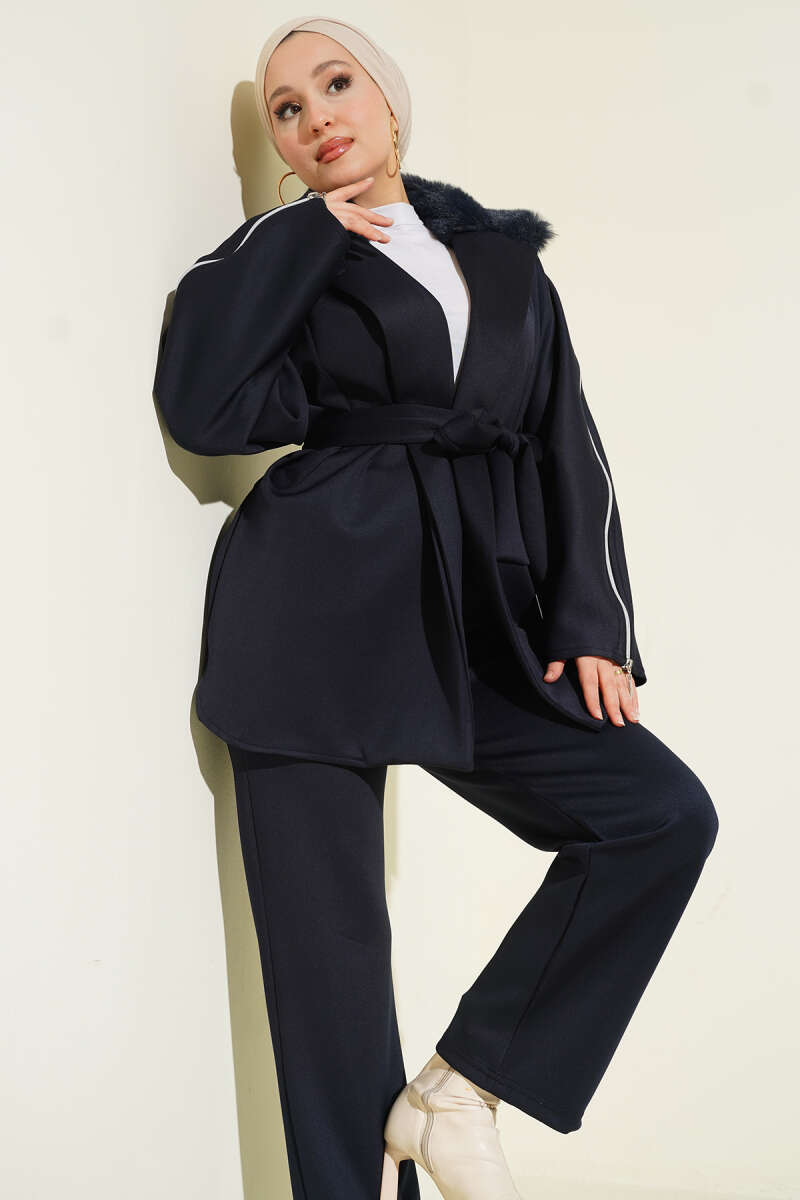 Bel Pensli Kuşaklı Loyşa Etekli İkili Takım Lacivert