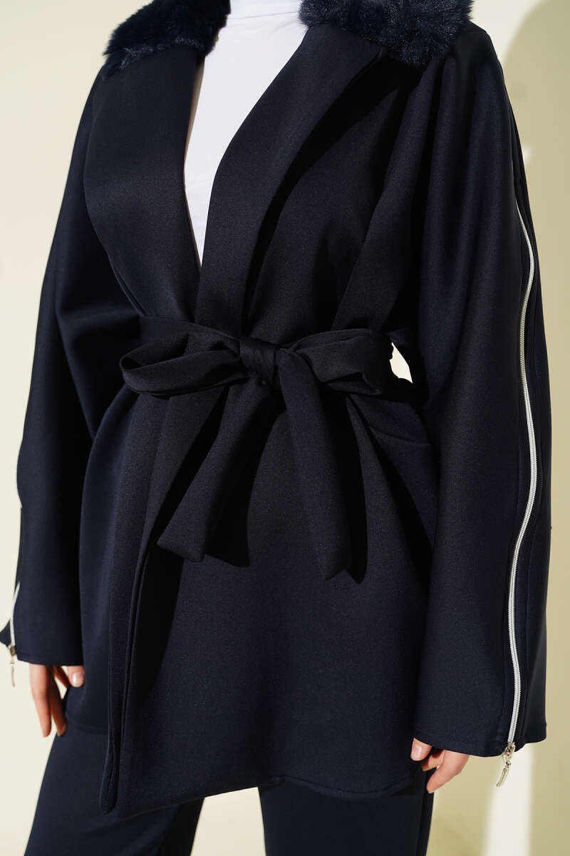 Bebe Yaka Kuşaklı Kaşe Kaban Siyah