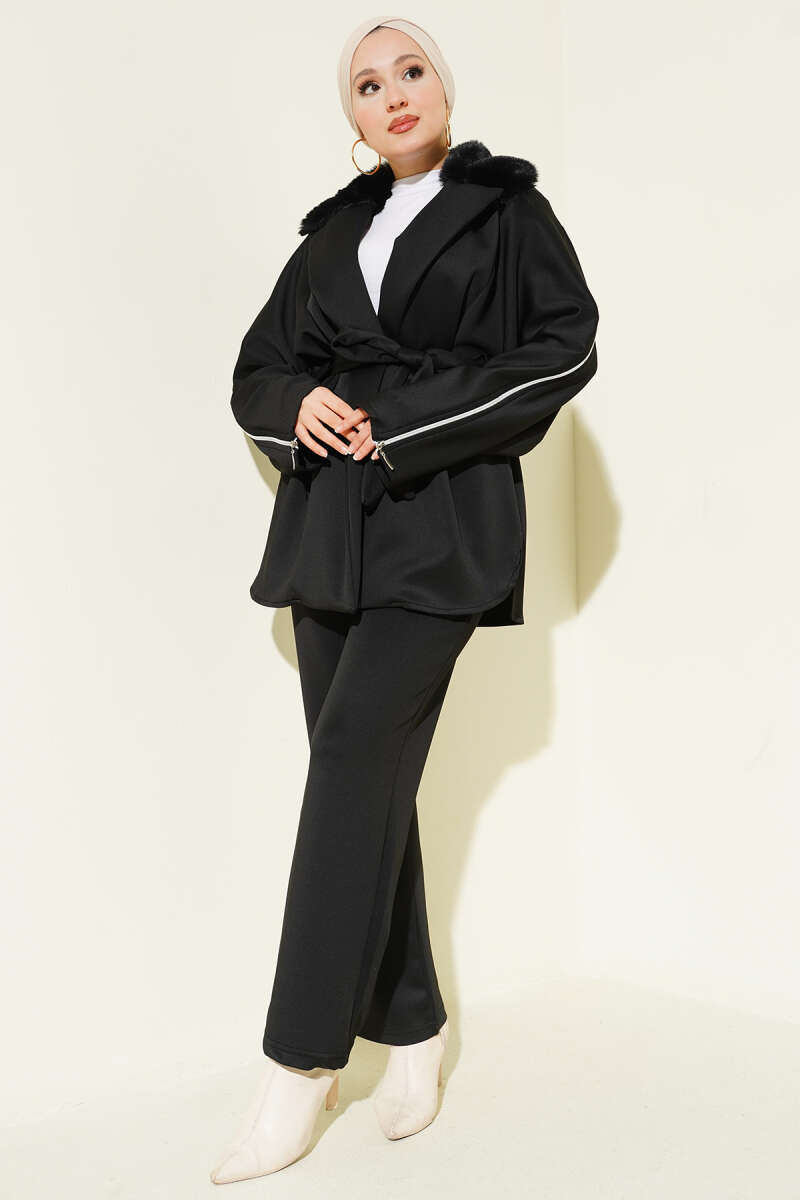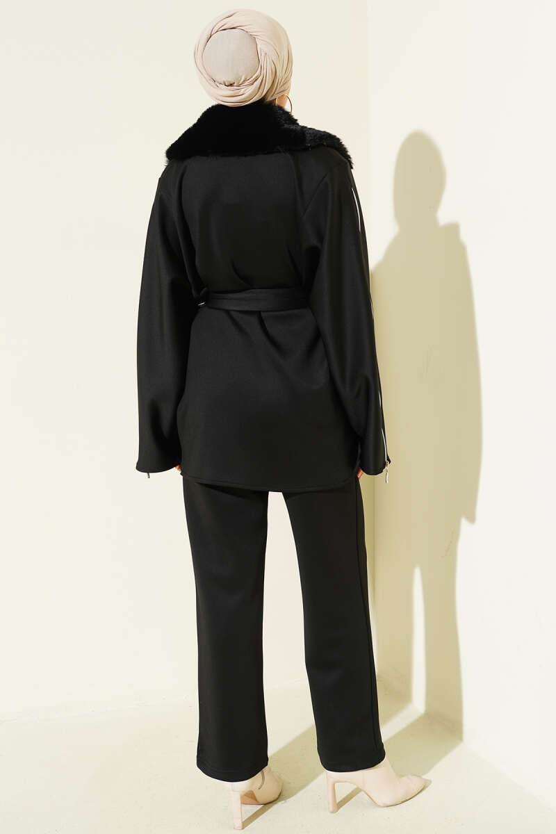 Kol Fermuarlı Yaka Kürklü Scuba İkili Takım Kahve