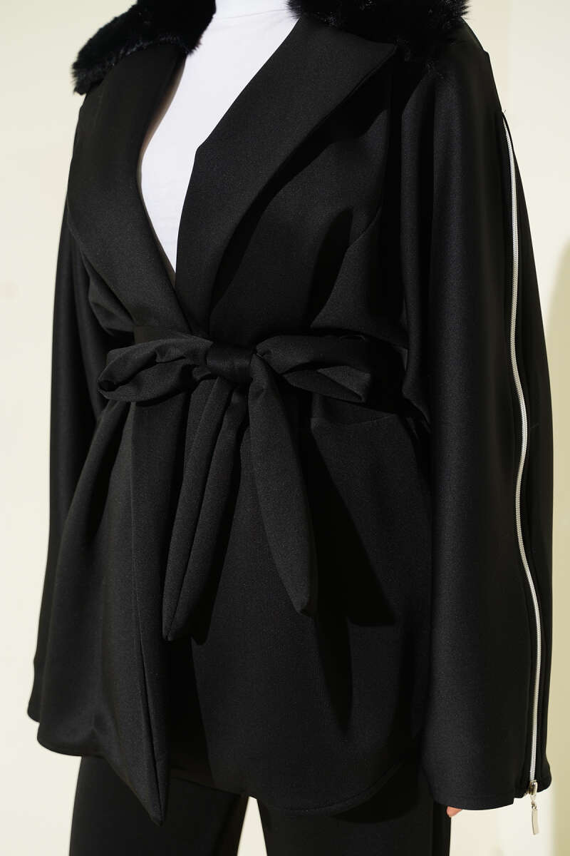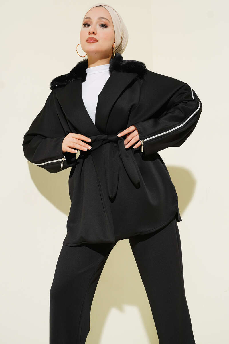 Bebe Yaka Kuşaklı Kaşe Kaban Siyah