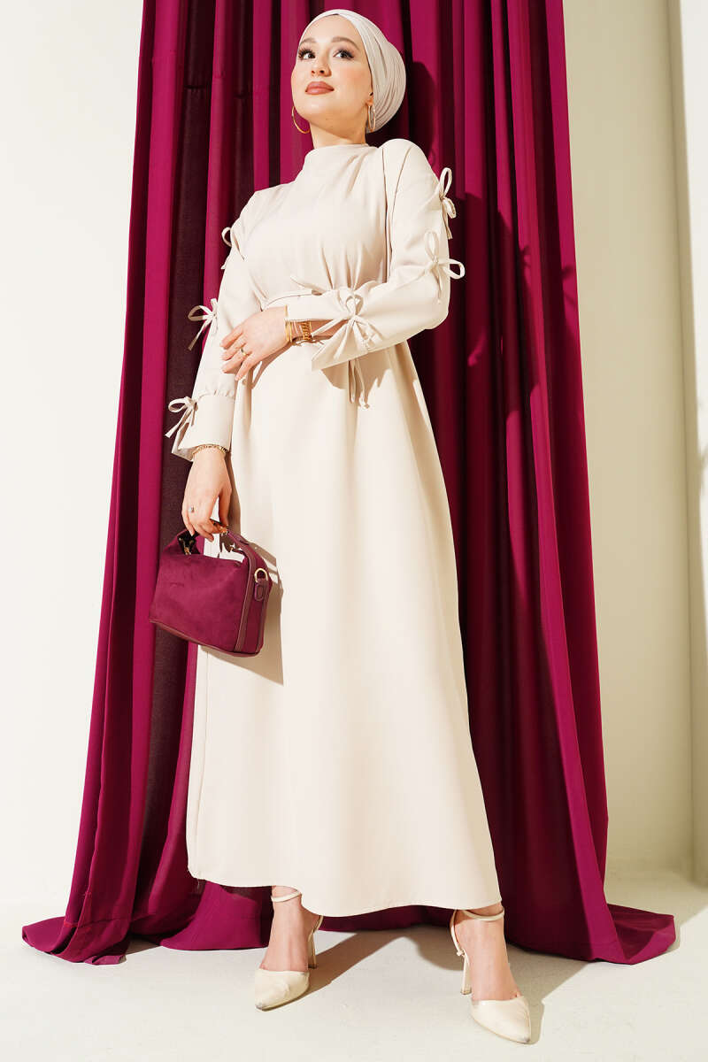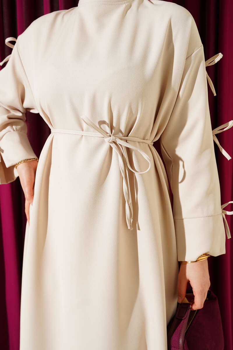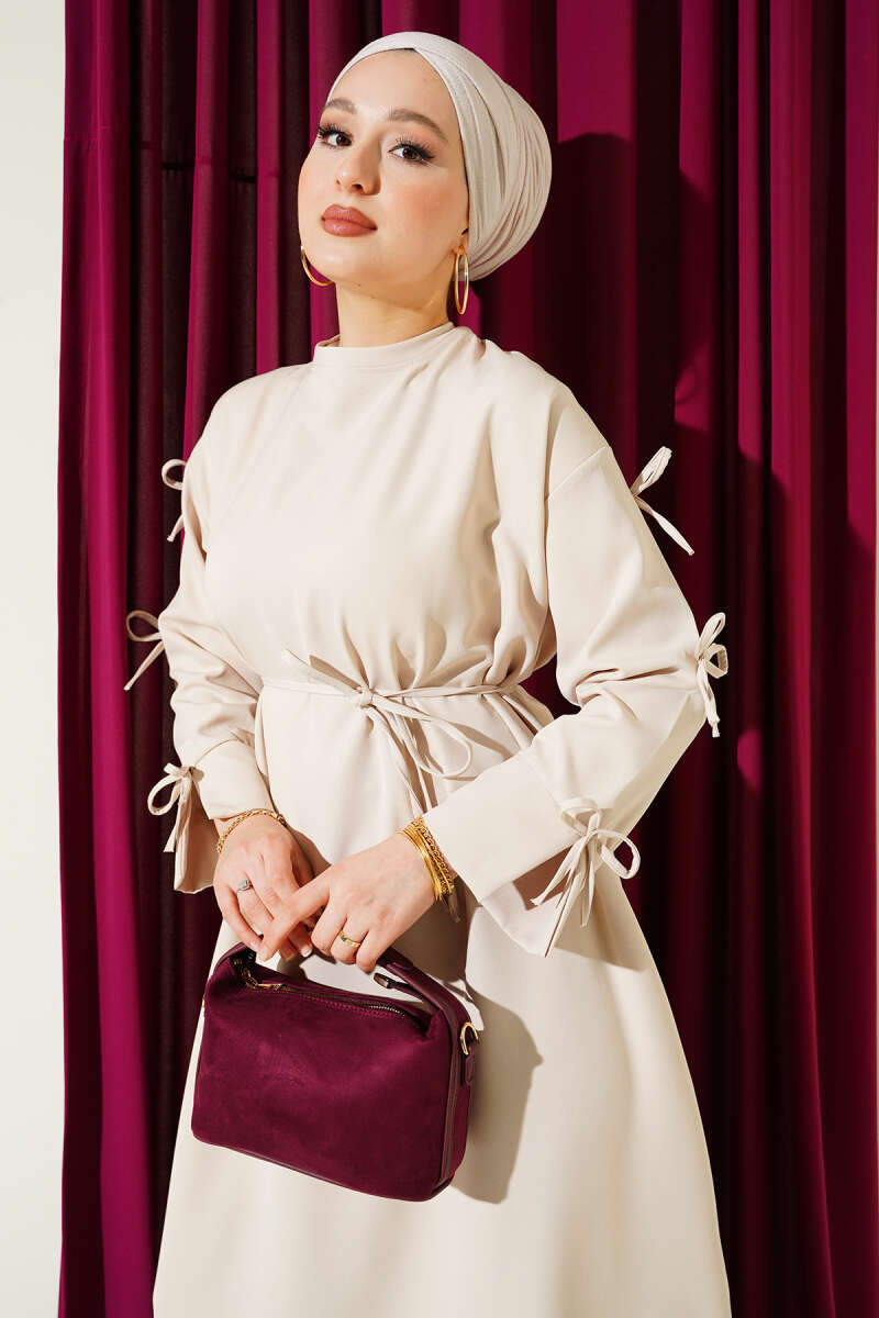 Kol Fiyonklu İp Kuşaklı Dabıl Elbise Bordo