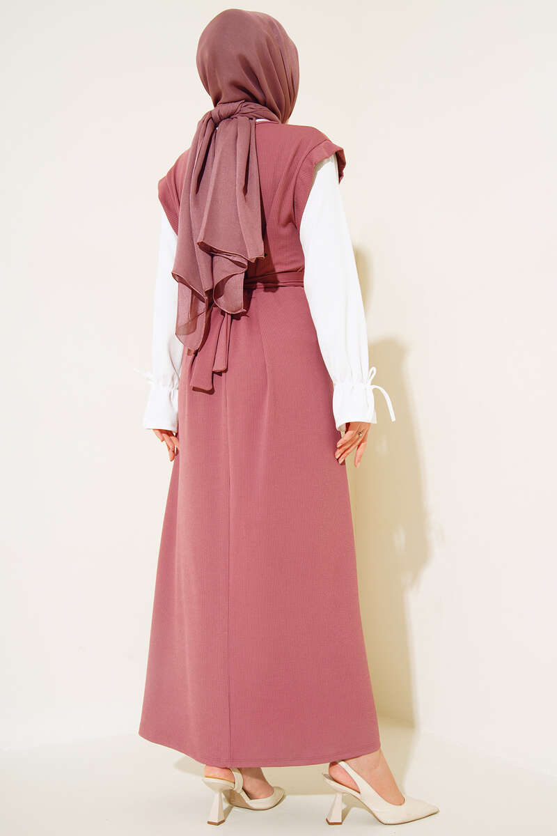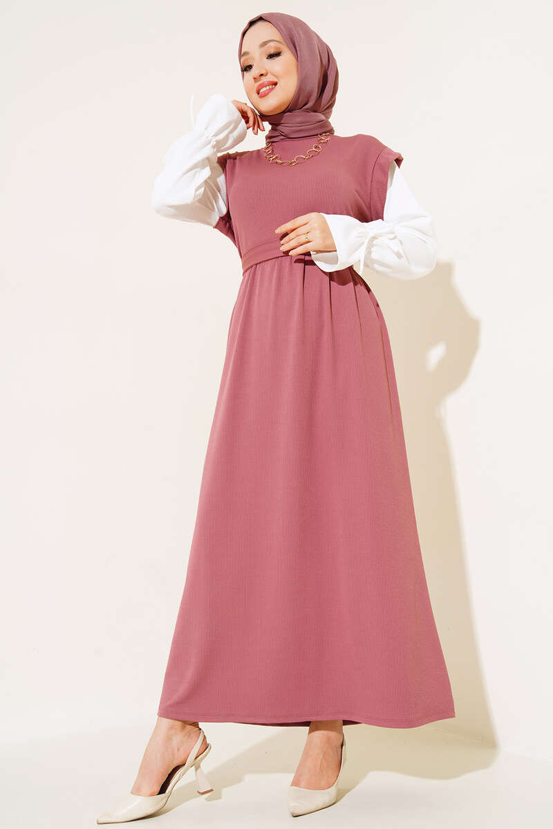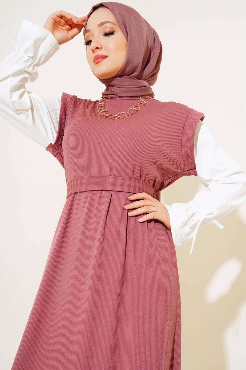Kol Garnili Kuşaklı Elbise Gül Kurusu
