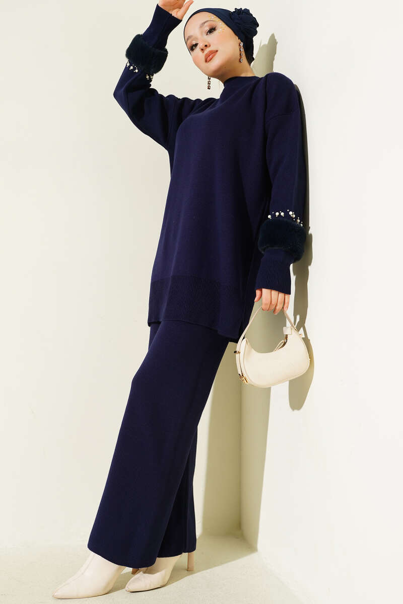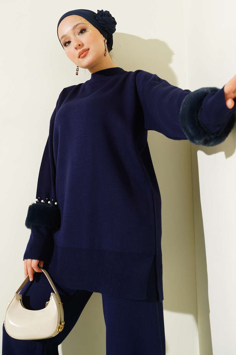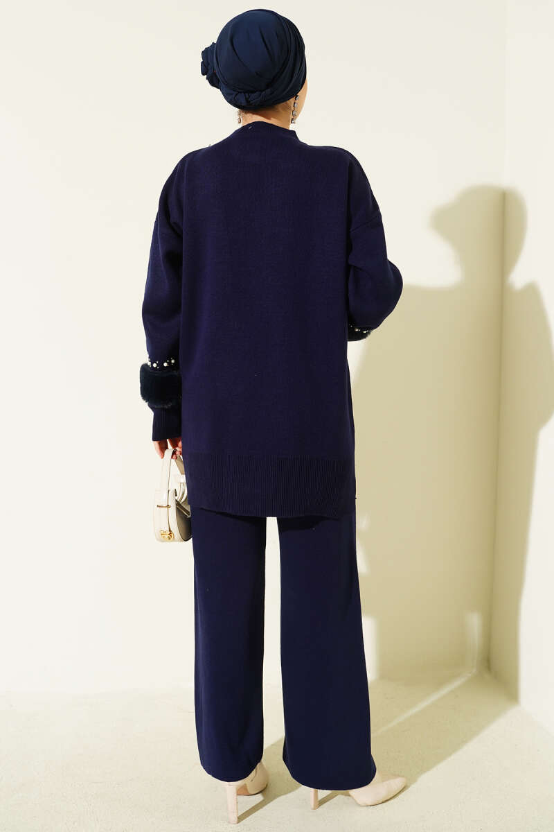 Yarım Fermuarlı Şerit Detaylı Triko İkili Takım Lacivert