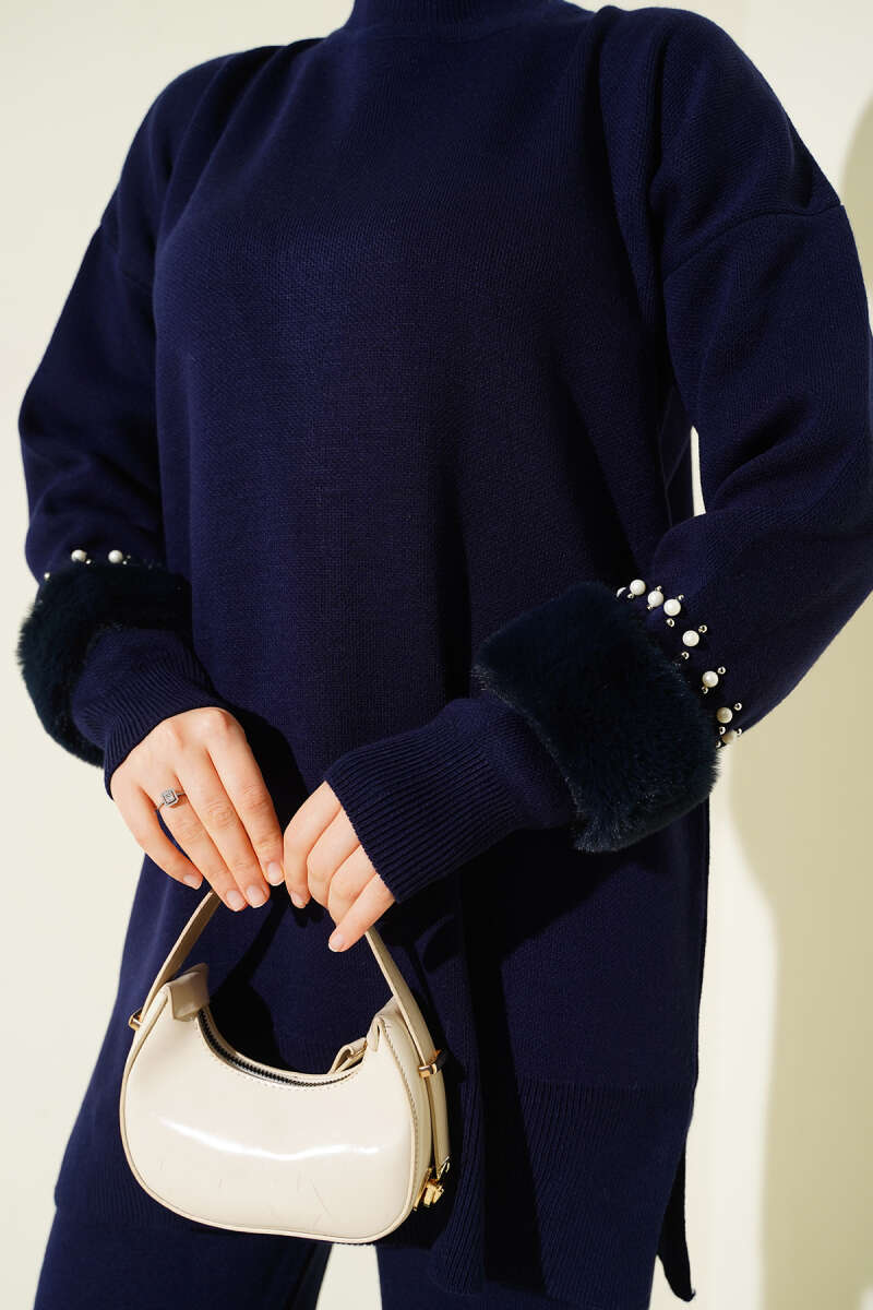 Kol İncili Kürklü Triko İkili Takım Siyah