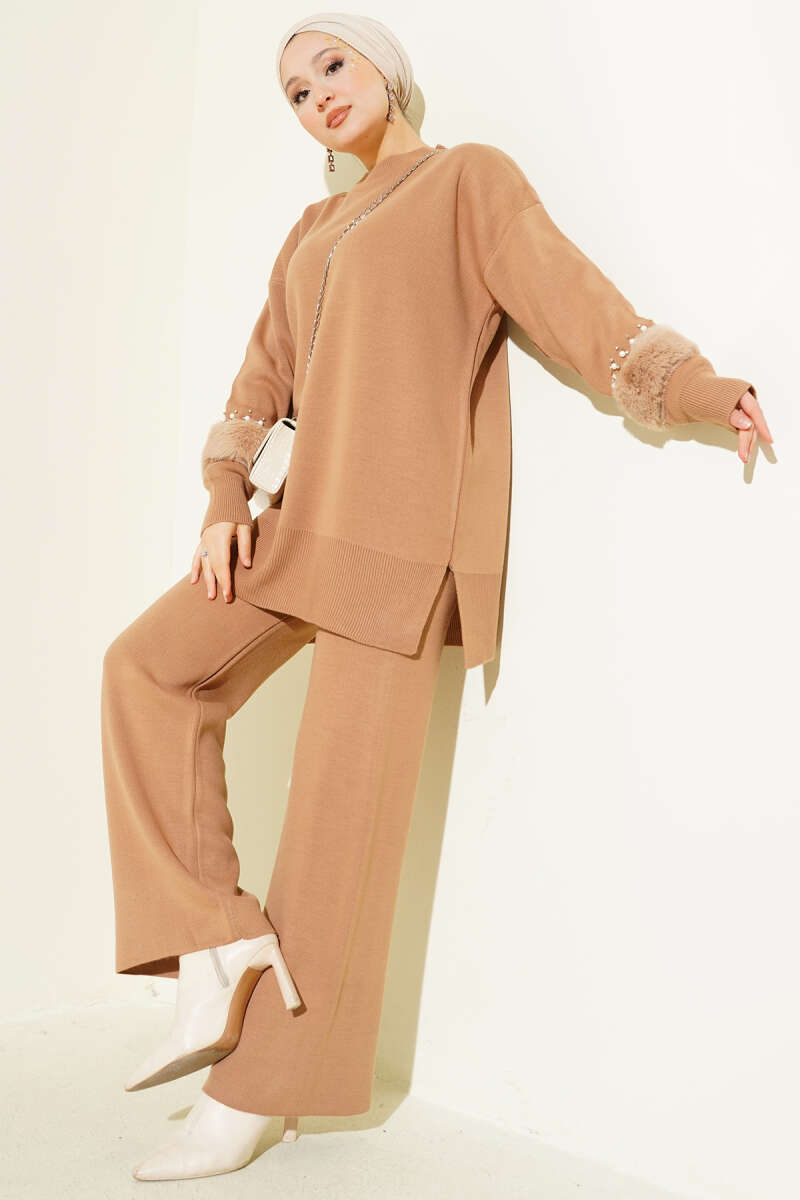 Kol İncili Kürklü Triko İkili Takım Lacivert