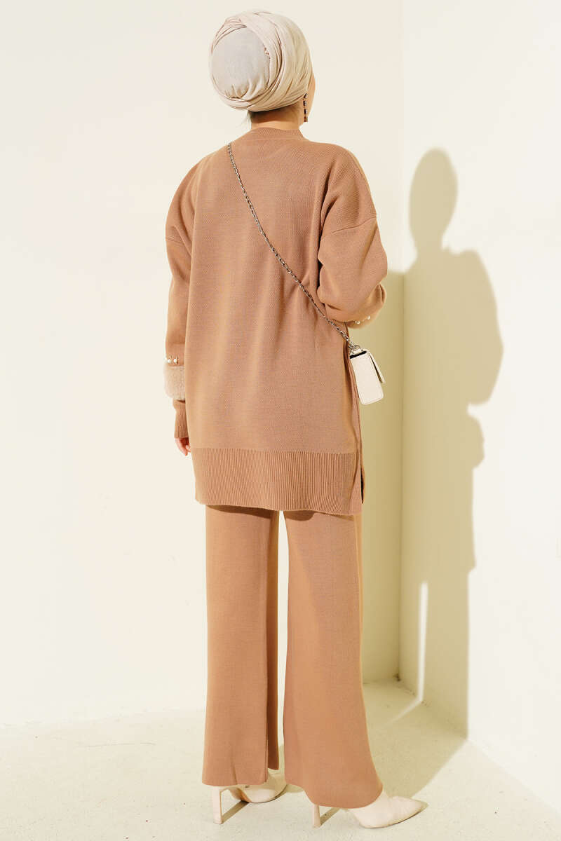 Yarım Fermuarlı Şerit Detaylı Triko İkili Takım Latte