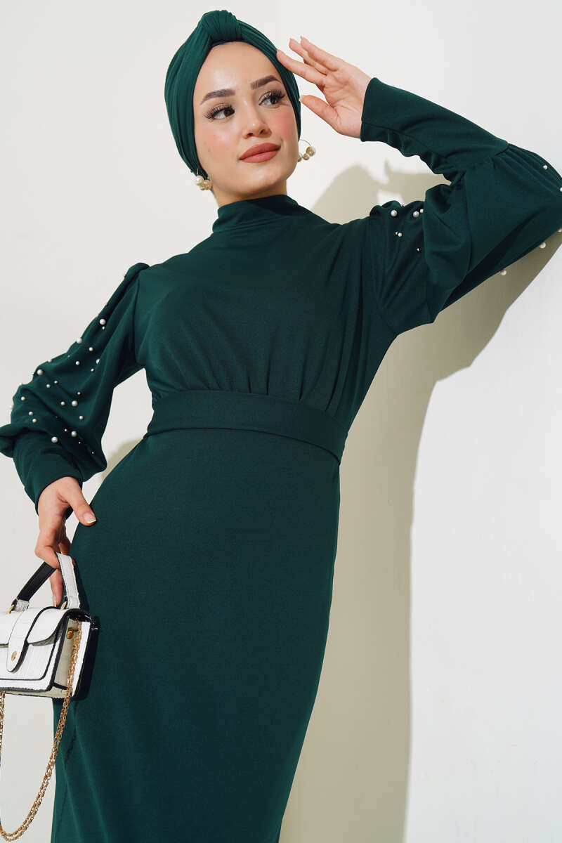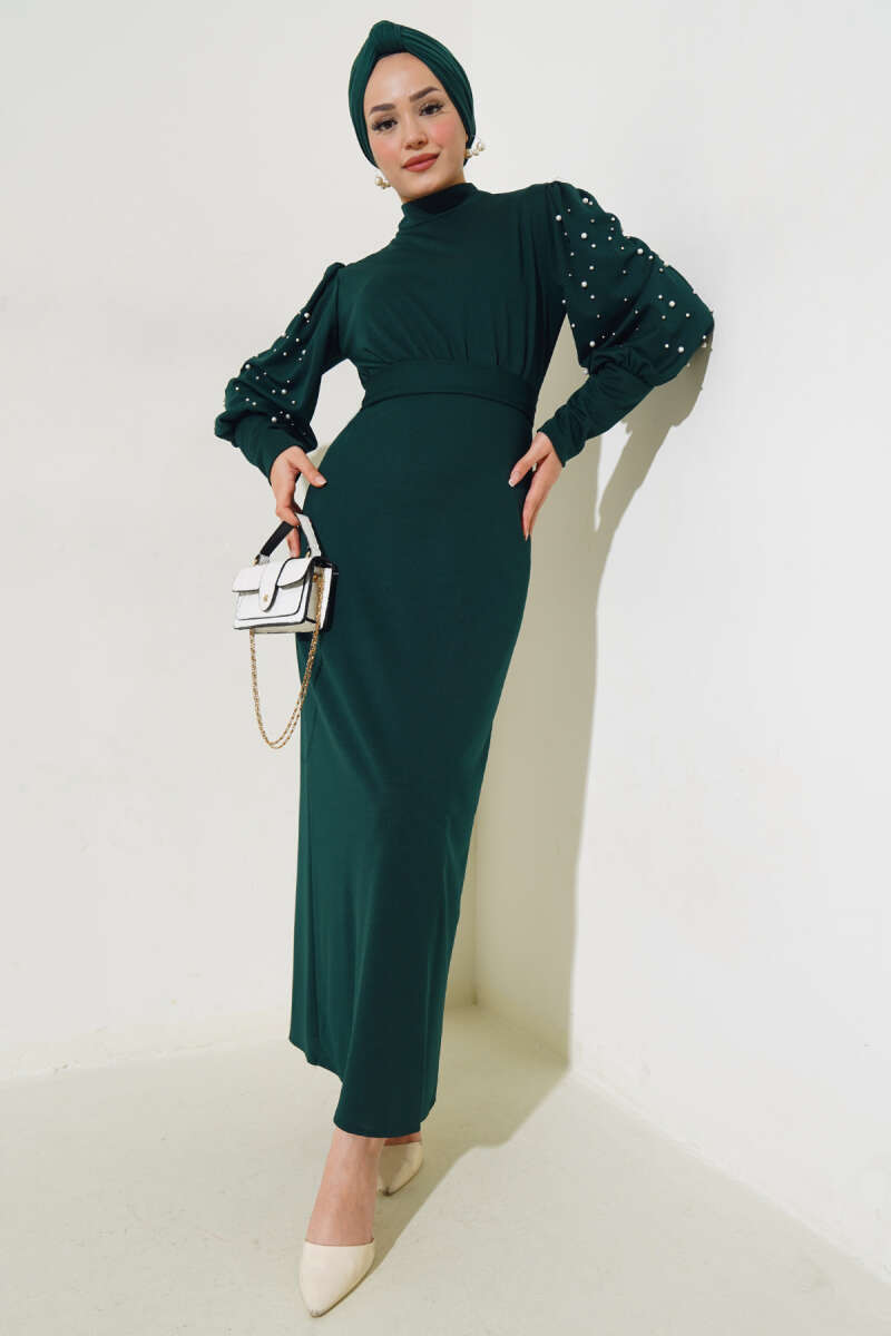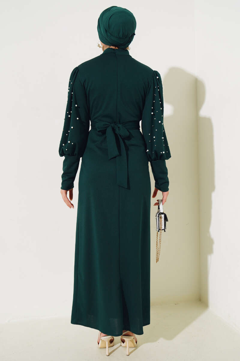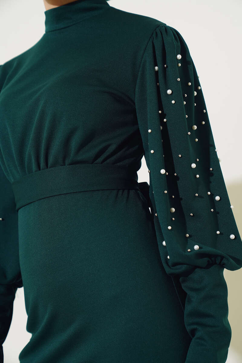 Kol İncili Kuşaklı Elbise Zümrüt