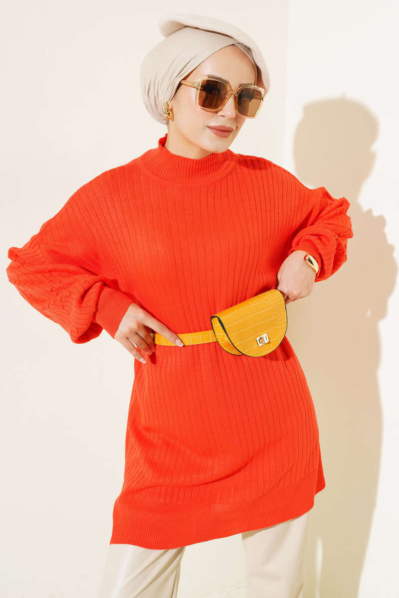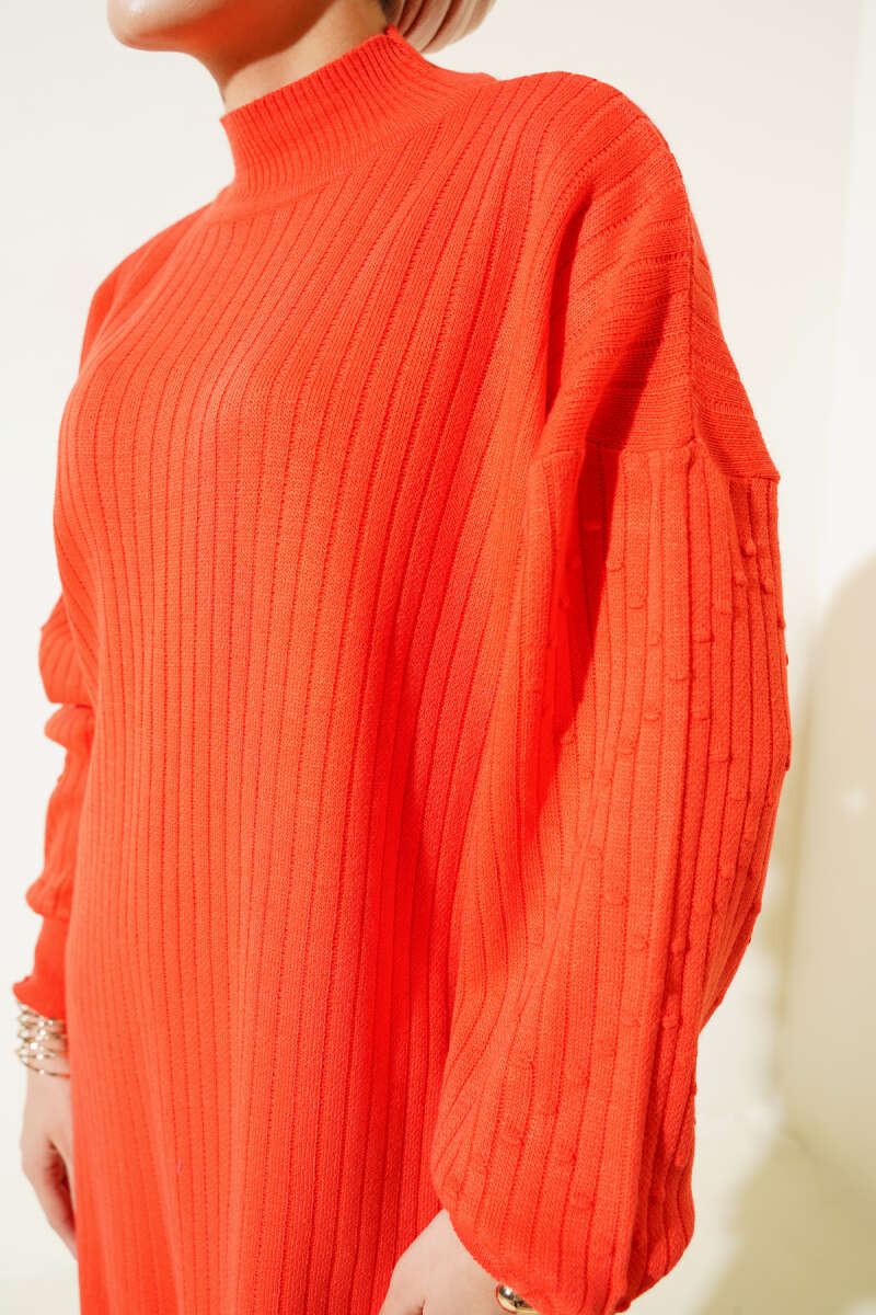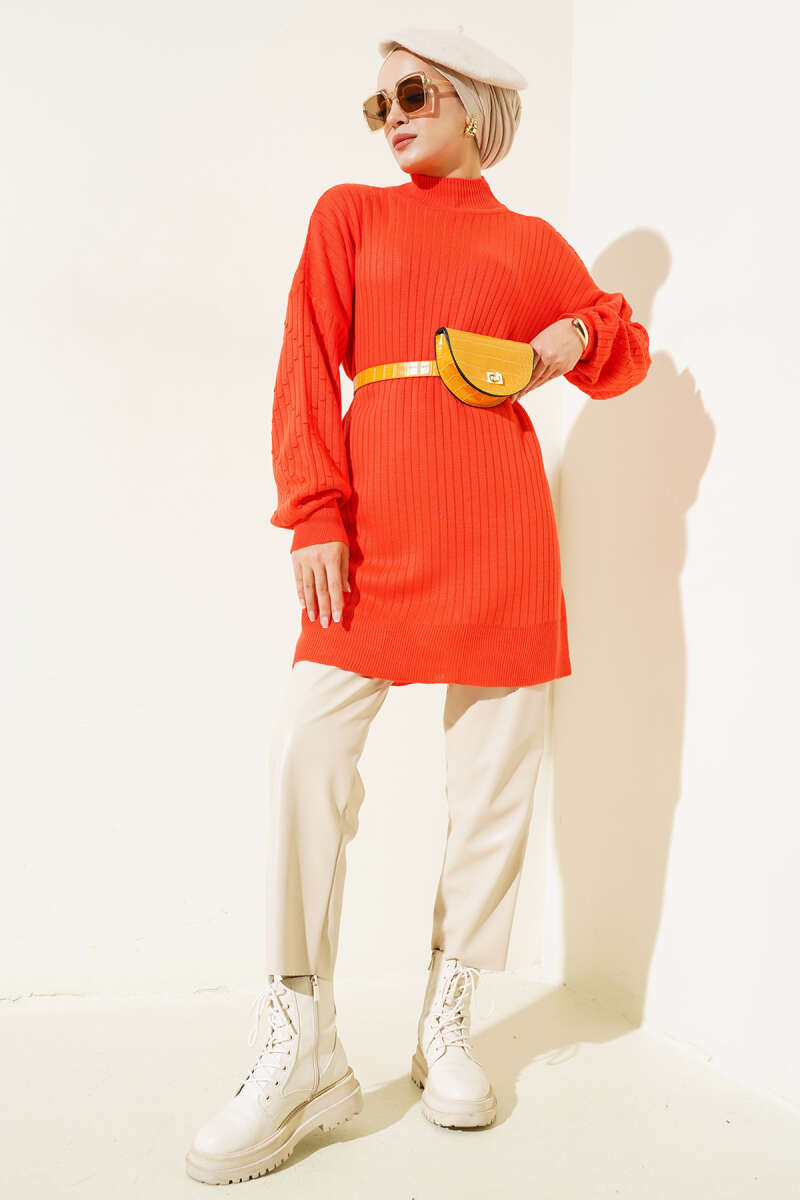 Kol Kabartmalı Fitilli Triko Tunik Bordo