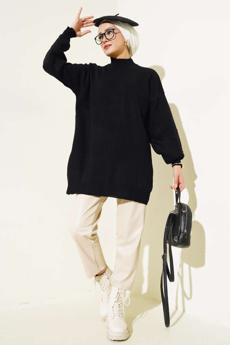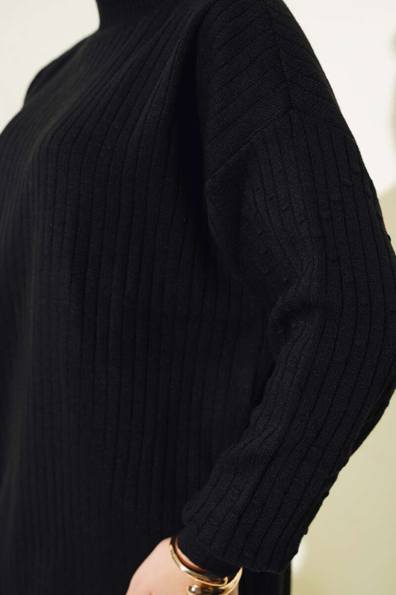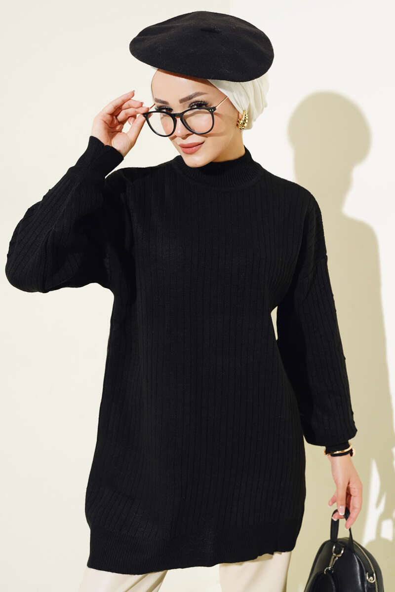 Yaka Fularlı Yumoş Triko Tunik Siyah