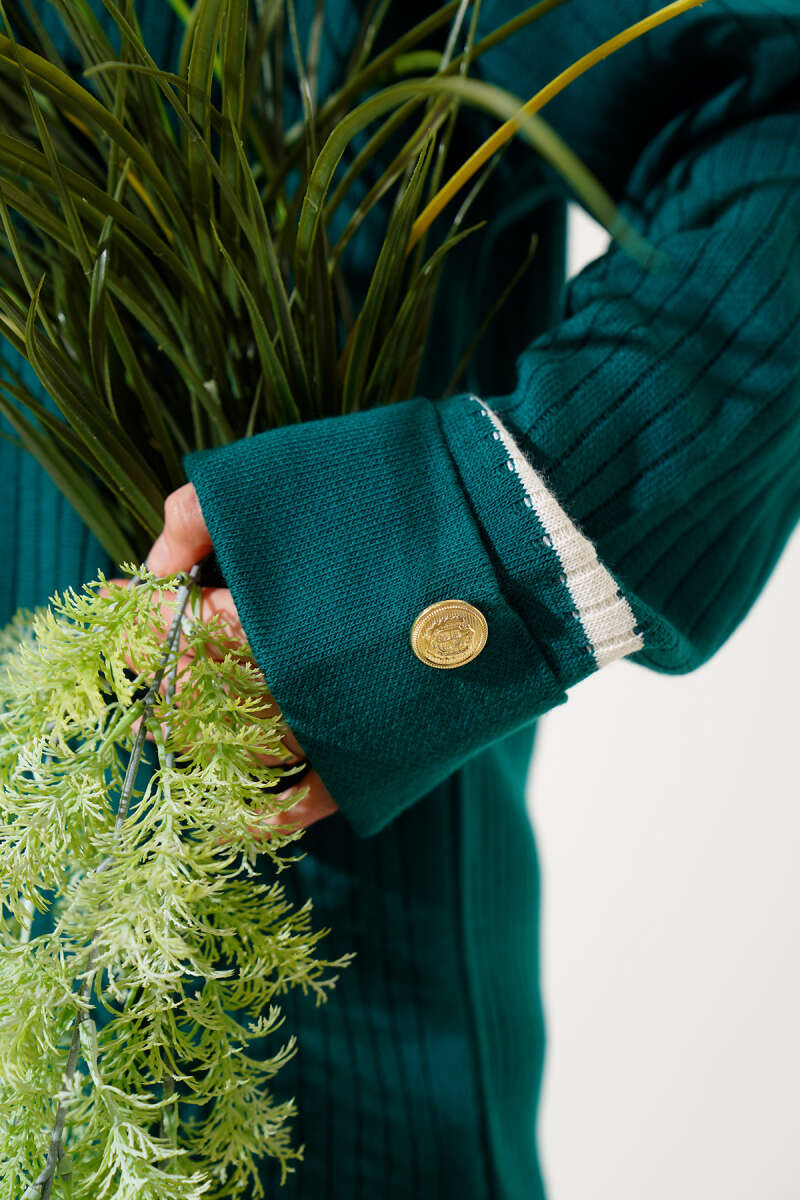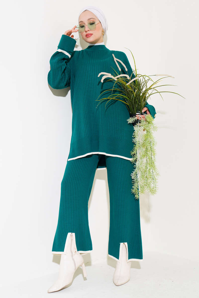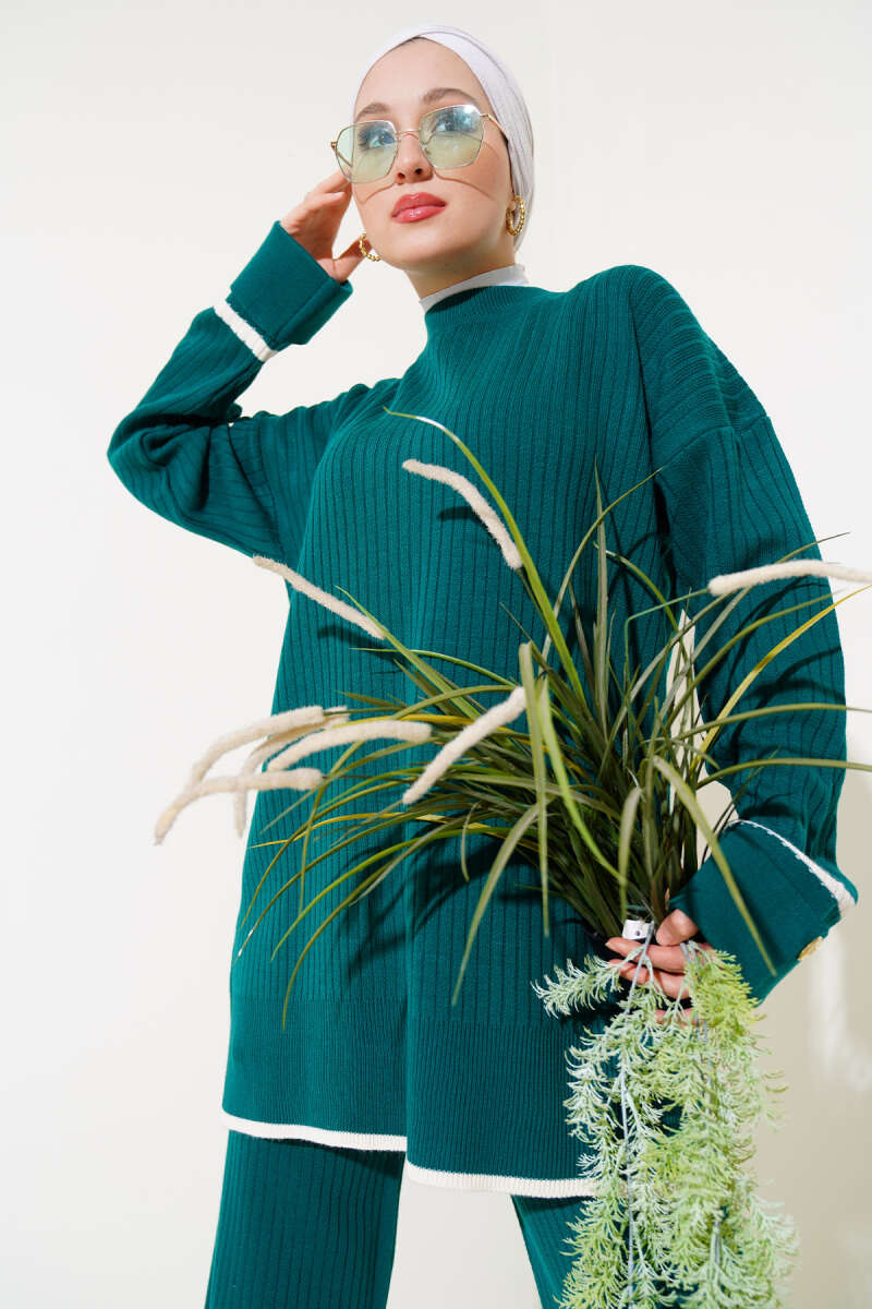 Kol Katlamalı Düğmeli Triko İkili Takım Zümrüt