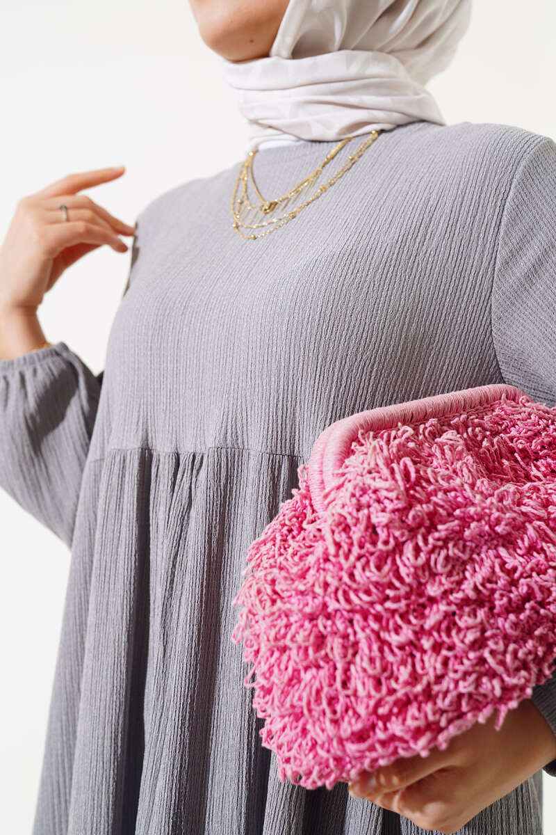 Kuşaklı Dik Fitilli Kaşe Elbise Gri
