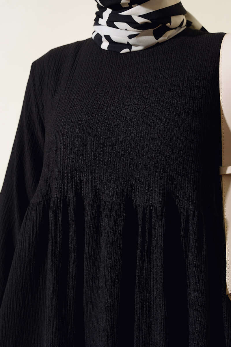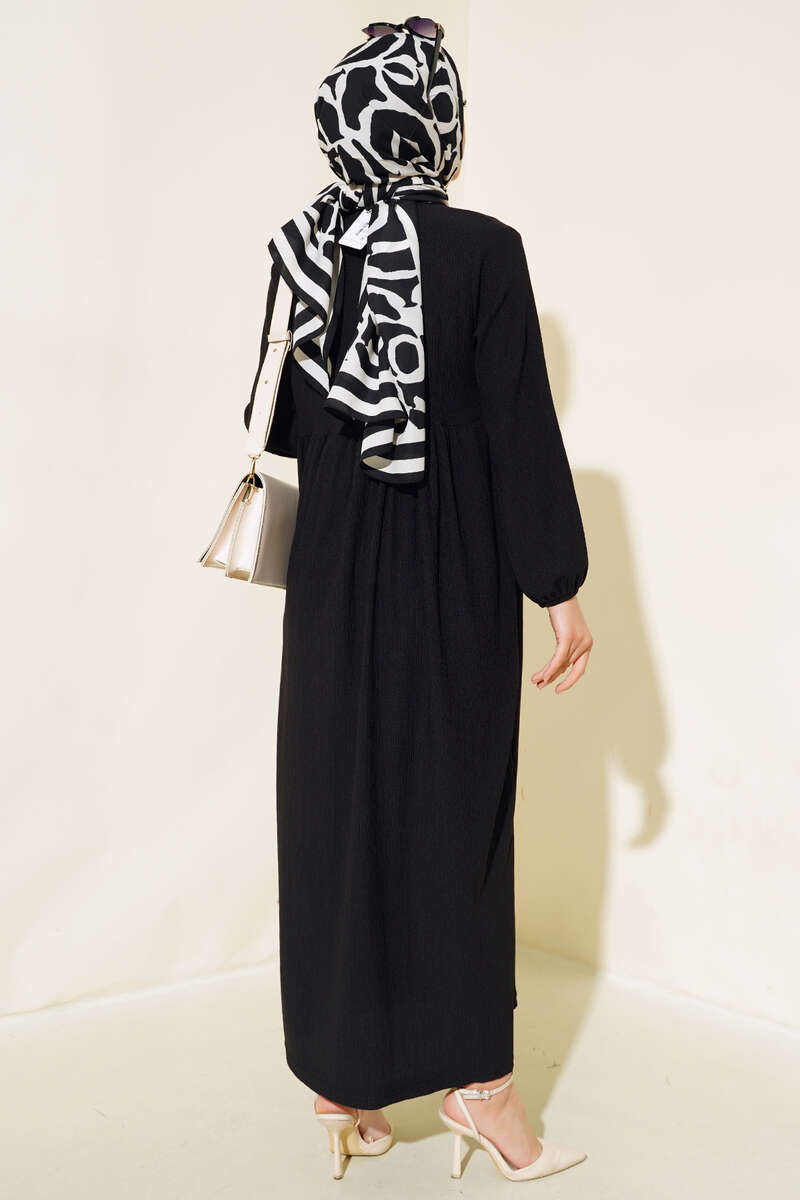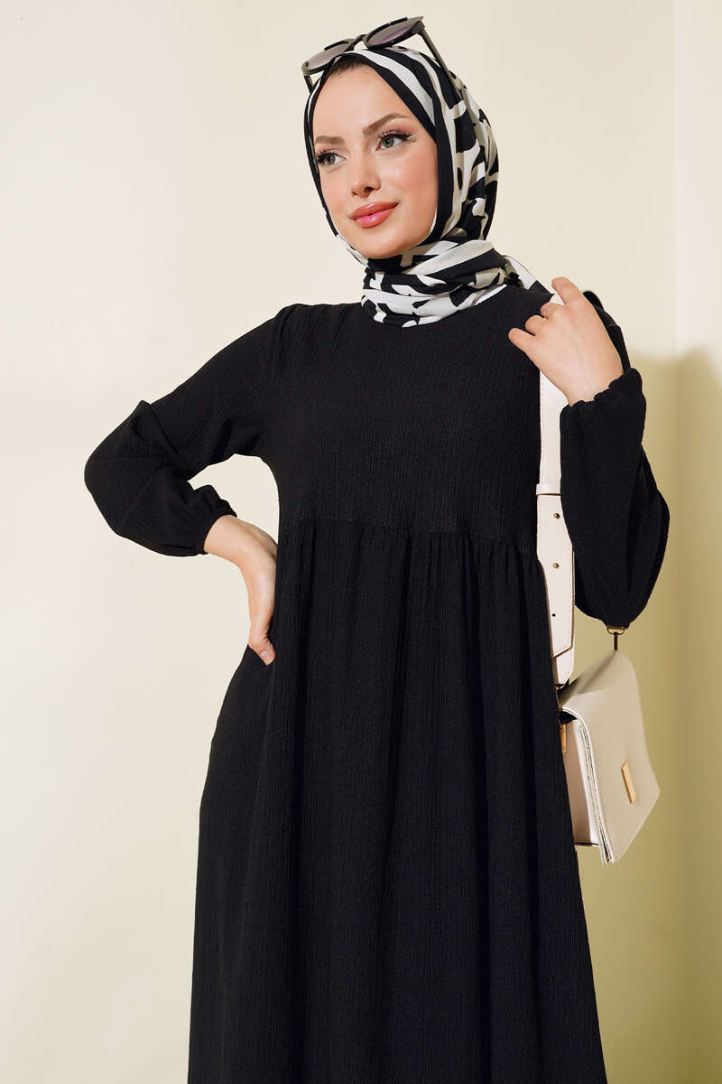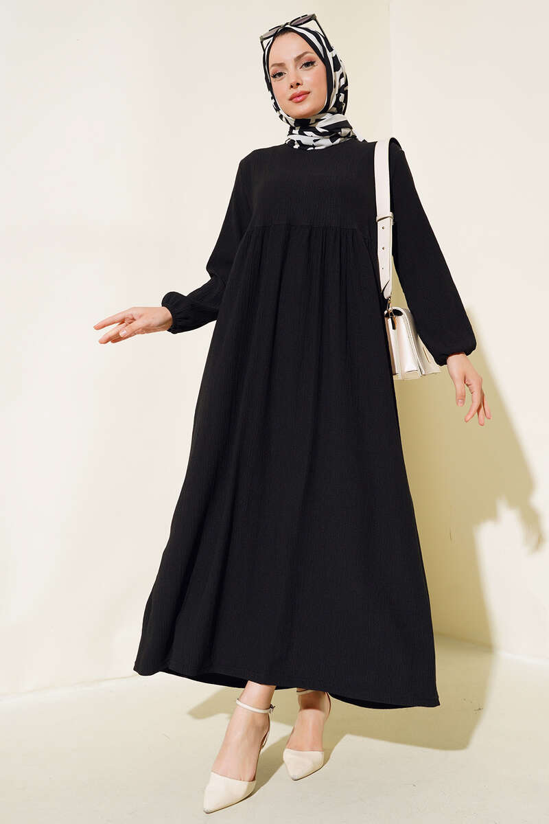 Kol Lastikli Bürümcük Elbise Siyah