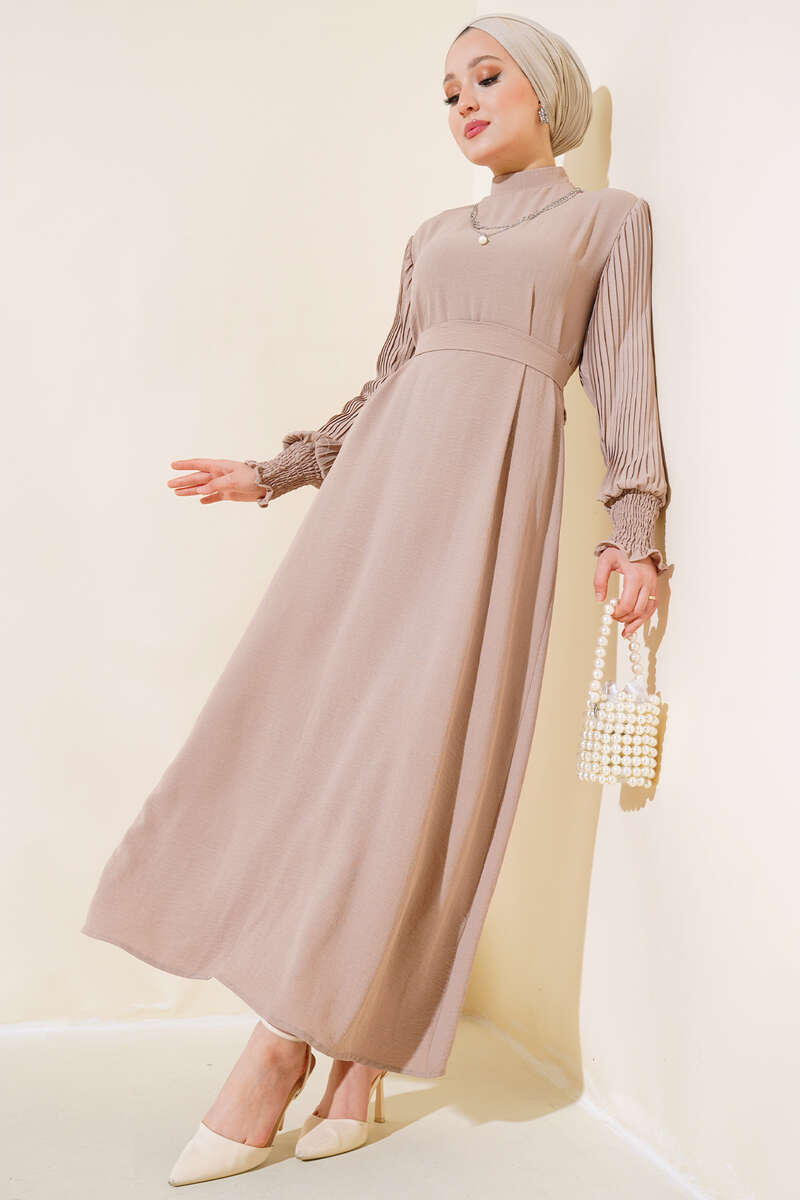 Yeni sezon elbisemiz sizlerle beraber. Elbisemizin kol bilekleri büzgülüdür. Kolları pilelidir. Belinde iki adet kemer köprüsü ve kendi kumaşından kuşağı bulunur. Elbisemizin renk seçenekleri mevcuttur.