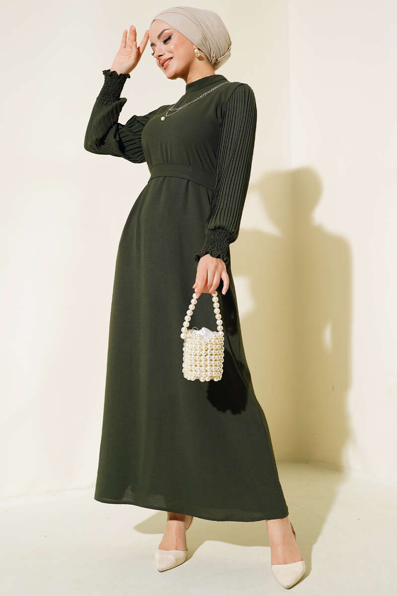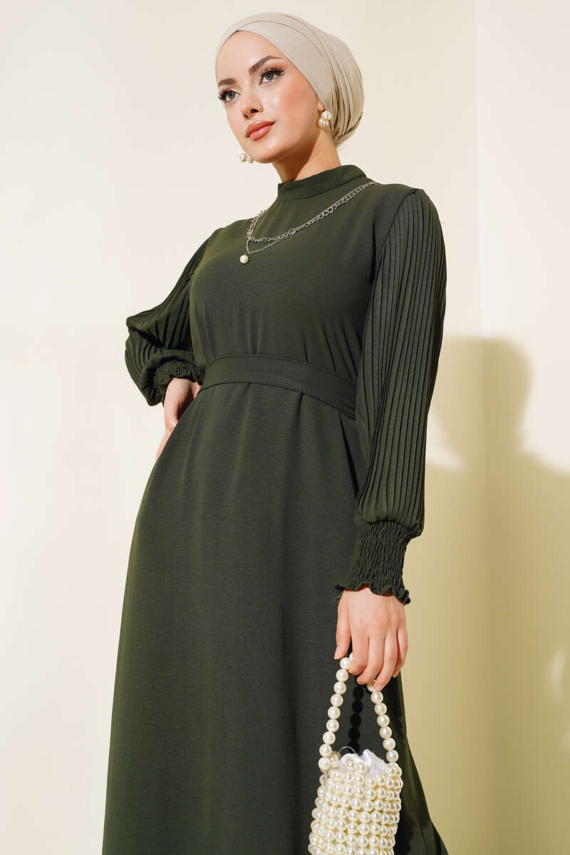 Kol Piliseli Elbise Haki