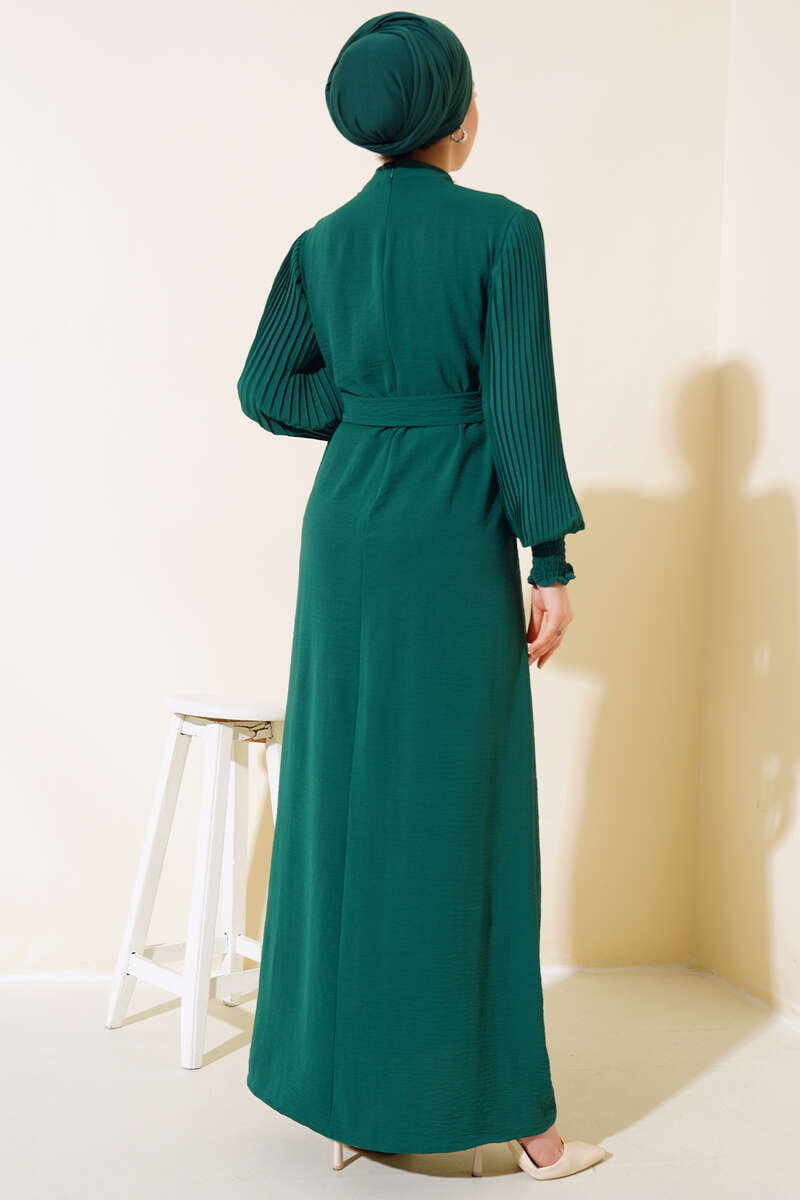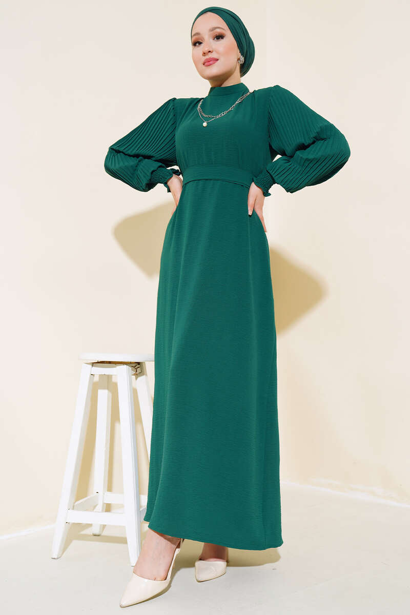Yeni sezon elbisemiz sizlerle beraber. Elbisemizin kol bilekleri büzgülüdür. Kolları pilelidir. Belinde iki adet kemer köprüsü ve kendi kumaşından kuşağı bulunur. Elbisemizin renk seçenekleri mevcuttur.